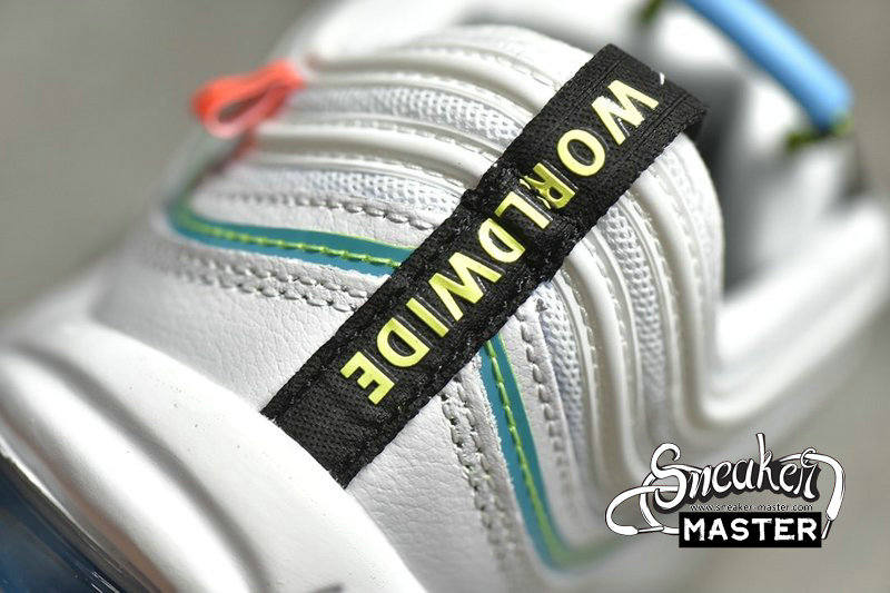 - Part of the Worldwide Pack that celebrates the unifying power of sports, the Air Max 97 'Worldwide Pack - White' features vibrant accents. The shoe's mesh and leather upper appears primarily in white, highlighted by a gradient wavy overlay around the midfoot. A similar two-tone look marks the Swoosh branding, matched by the visible Max Air unit underfoot. A globe icon on the lateral collar and 'Worldwide' on the heel complete the look.