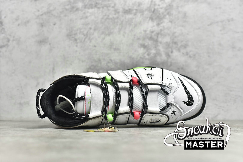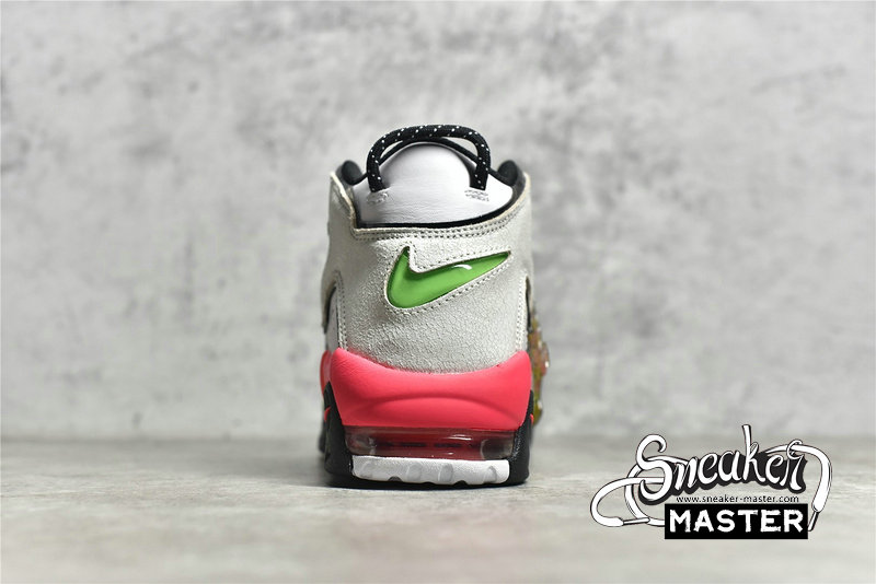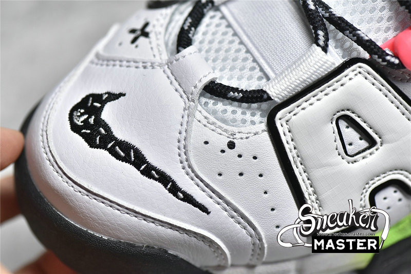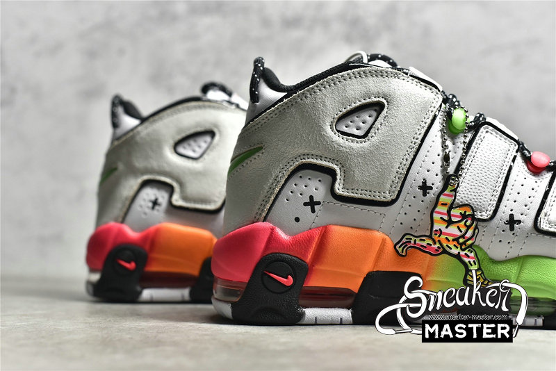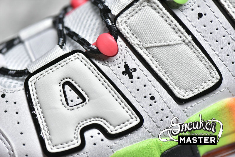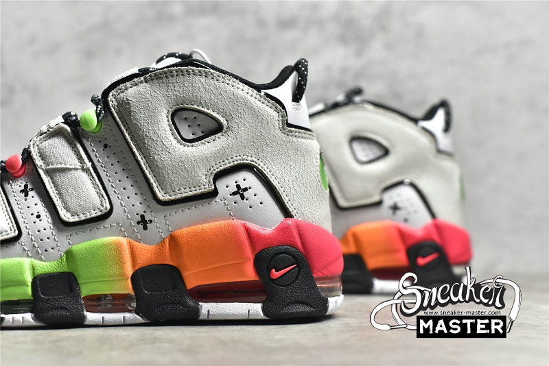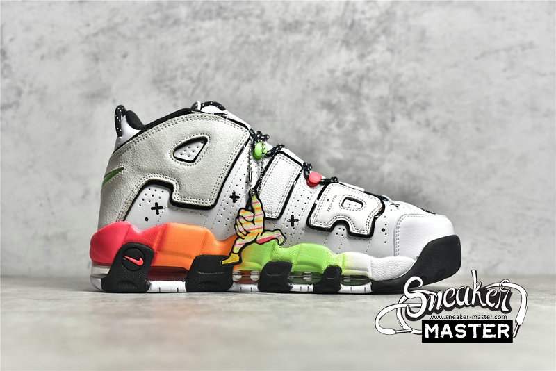 - This offering of the Nike Air More Uptempo features a White leather base with mix materials used on the removable “AIR” lettering. Other details includes Black mini toe Swooshes with smiling ghost face and sprinkles – which also appear on the tongues, vibrant gradient midsoles with graphic insoles. The shoes also come with a special hangtag.