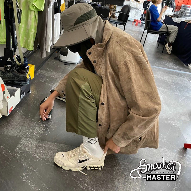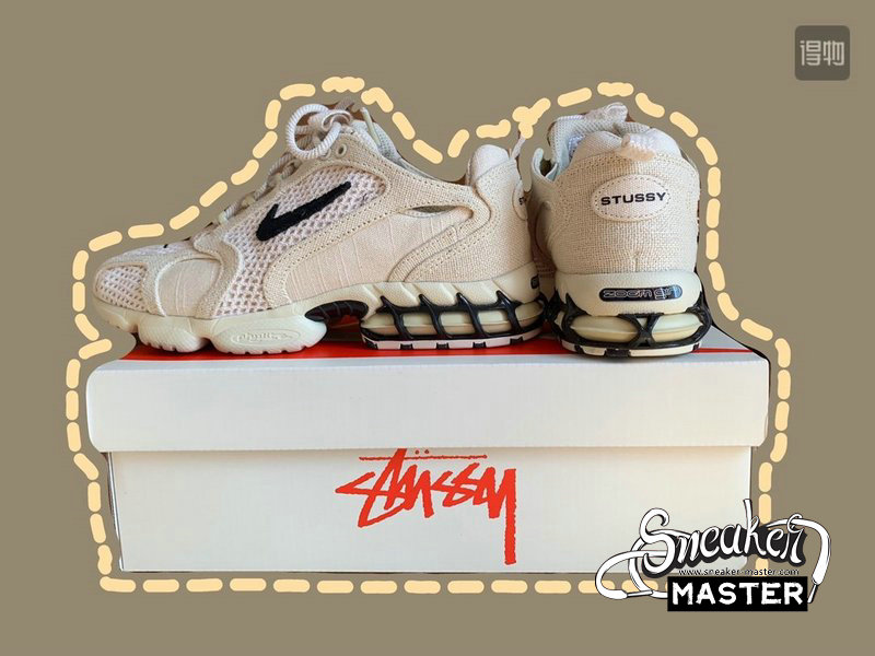 - The Stussy x Air Zoom Spiridon Caged 'Fossil' released as part of a collaboration with the streetwear brand. Featuring a two-tone look, the shoe's upper is built with open mesh and textile, finished with a Fossil base that's contrasted by black on the branding. Tongue and heel pull-loops provide easy on and off, while underfoot, a Phylite midsole with caged Zoom Air in the heel provides cushioning.