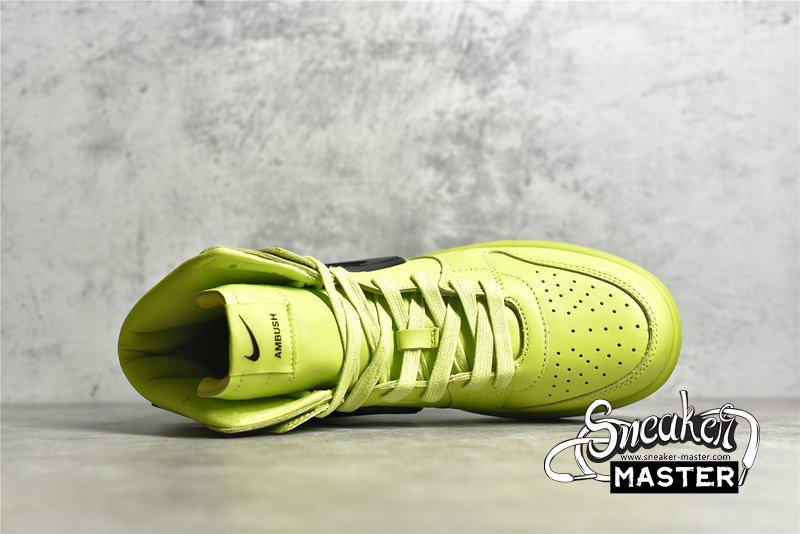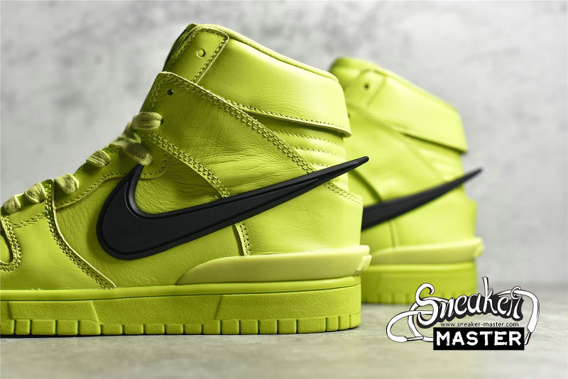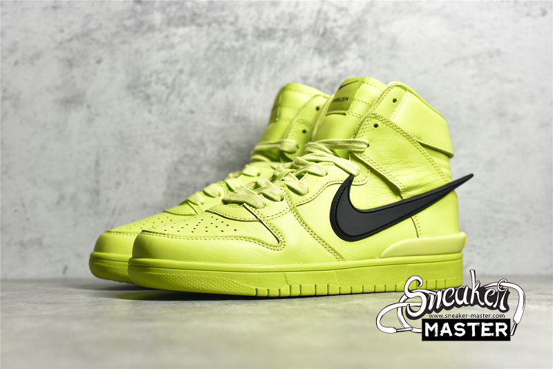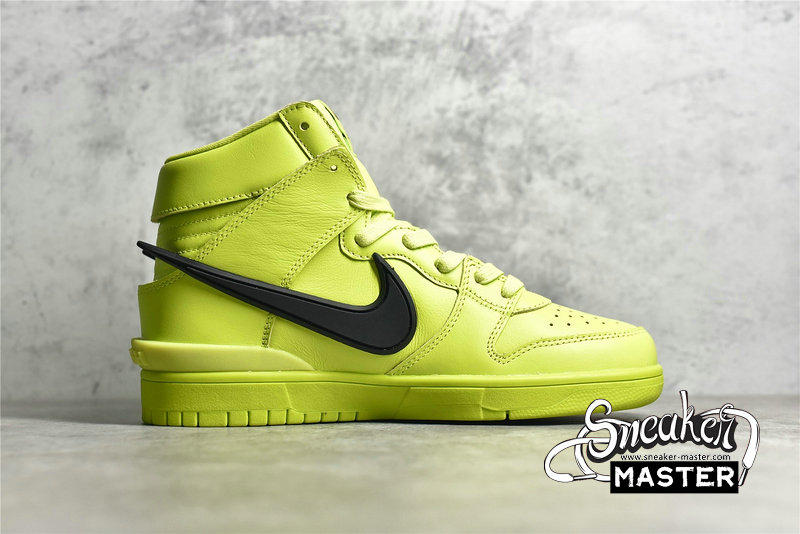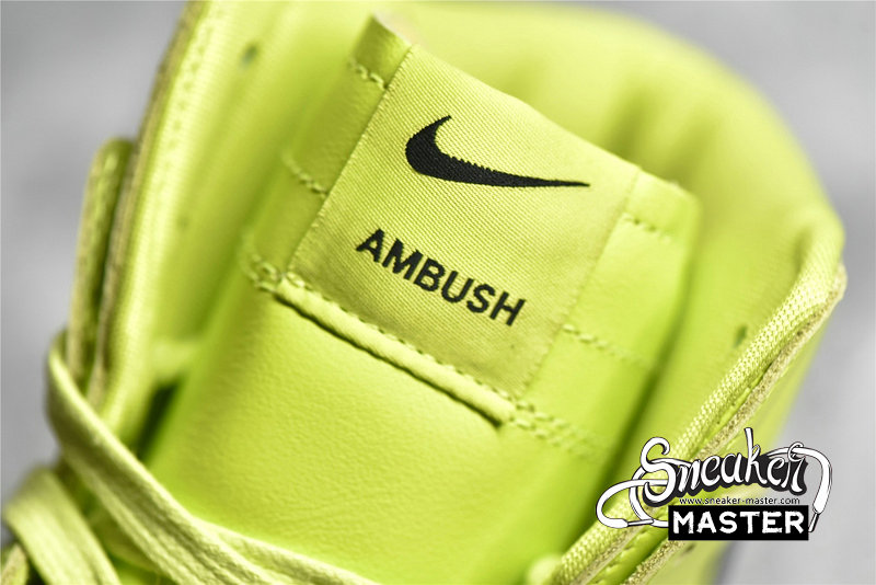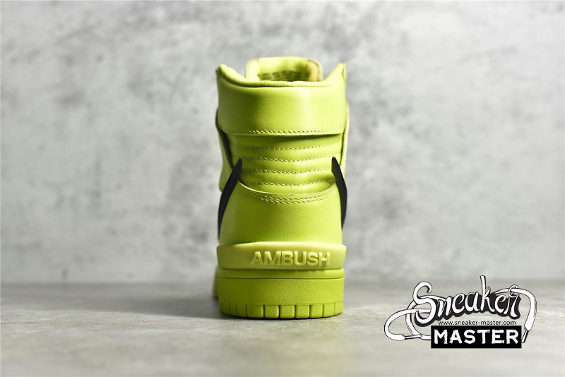 - A fourth collaboration on the retro basketball shoe, the AMBUSH x Dunk High 'Flash Lime' was designed with the help of Yoon Ahn. Drawing from the bright lights of Tokyo, the shoe's upper appears entirely in Flash Lime, built with leather and sporting a perforated toe box for breathability. An exposed-foam tongue, reconstructed collar and Ambush-branded heel counter add to the aesthetic, with a black TPU Swoosh, inspired by motorcycle exhaust pipes, extending past the heel. Underfoot, a tonal rubber cupsole bolsters the design.