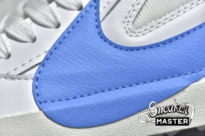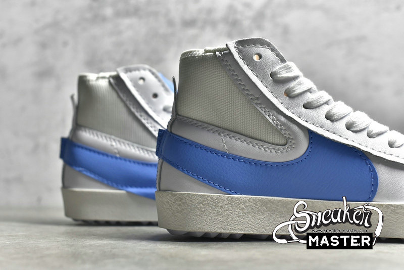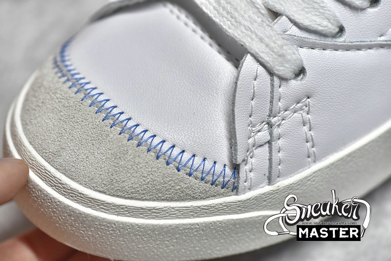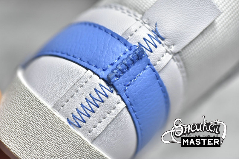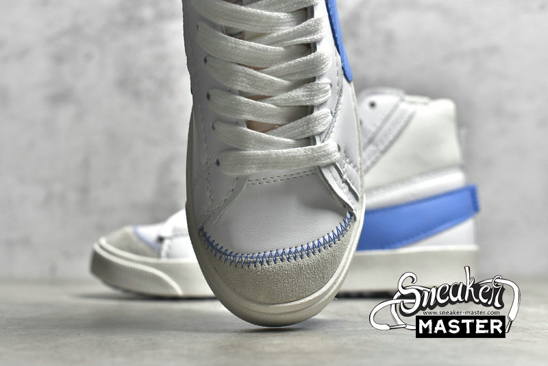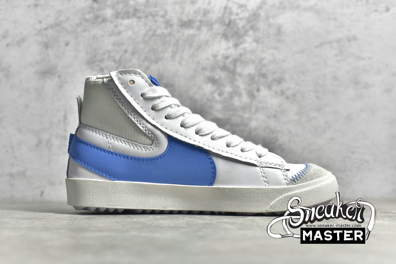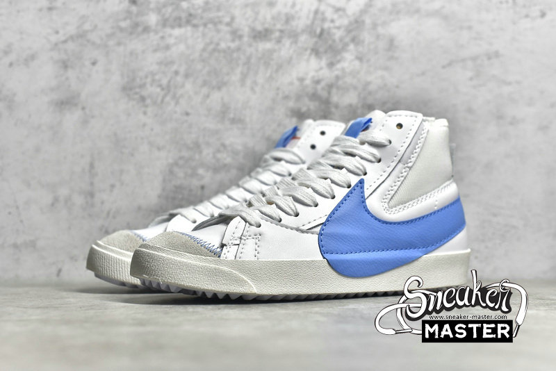 - This offering of the Nike Blazer Mid features a White base constructed in a mix of leather with suede at the toe along with a sock-like collar. A University Blue oversized “Jumbo” Swooshes on the sides, padded tongues atop a solid White rubber sole completes the design.