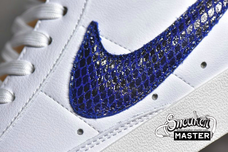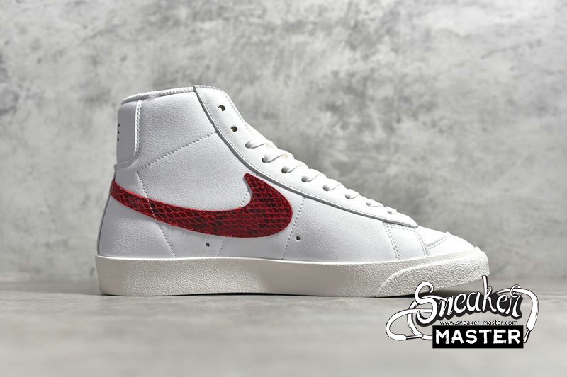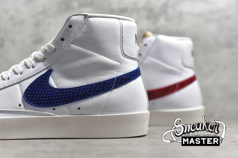 - The Blazer Mid '77 'Red & Blue' features unique Swoosh branding on its classic basketball construction. The signature branding emerges in blue snakeskin on the lateral side and red on the medial, while the upper itself is built with leather. An exposed-foam tongue adds to the look, while underfoot, the cupsole includes a herringbone pattern on the outsole.