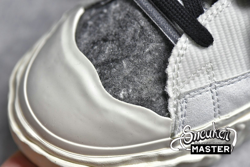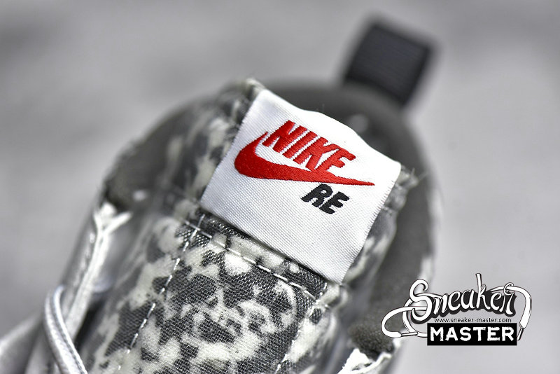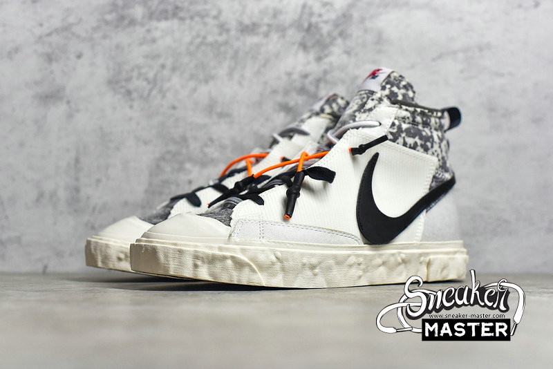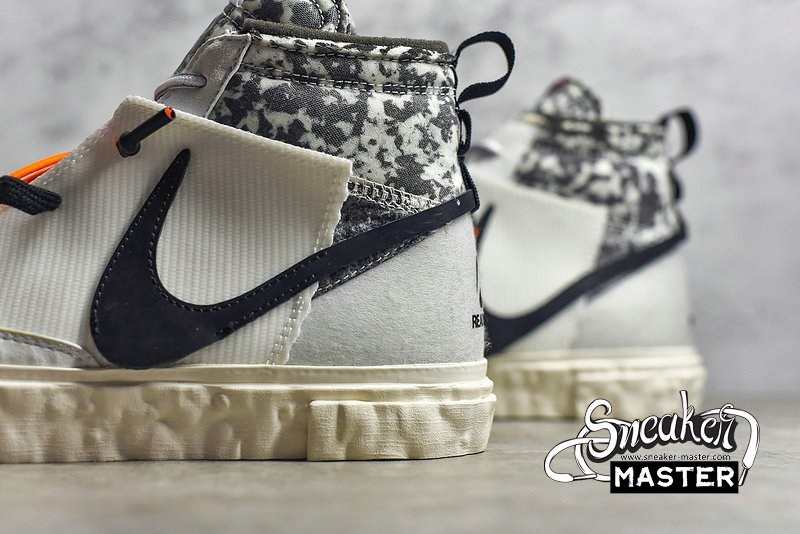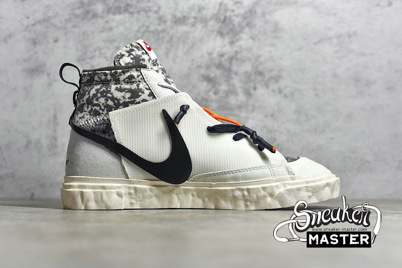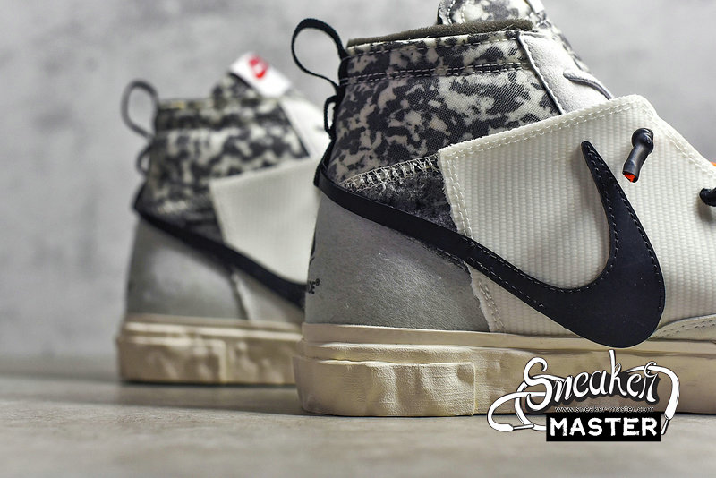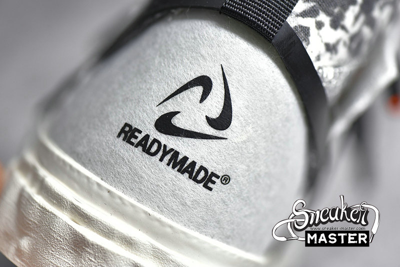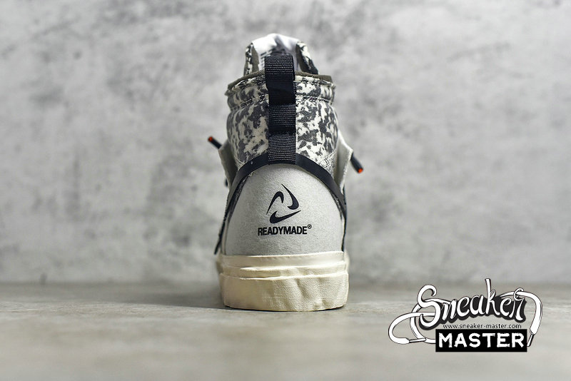 - Made in collaboration with the Japanese brand, the READYMADE x Blazer Mid 'White Camo' features a look drawn from their upcycled aesthetic. The shoe's upper is built with a mix of splotched foam and white leather overlays, configured in an irregular fashion. A stylized, half-stitched Swoosh marks the side wall, while the collar and tongue include further exposed foam. Three sets of laces make up the lacing system, while the heel and sockliner include READYMADE branding. A herringbone rubber outsole that incorporates Nike Grind provides traction.