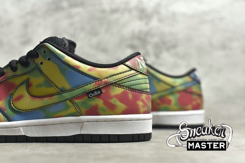 - The Civilist SB Dunk Low features a Black heat-activated upper with hidden thermal imaging in multicolored tones when exposed to heat, and turns back Black when exposed to cold. Civilist label on the lateral atop a White midsole and Black rubber outsole with graphic insoles completes the design.