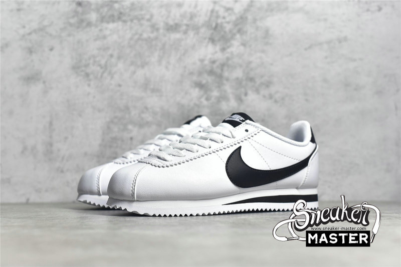 - This white and black version of the classic running shoe features a white leather upper with black Swoosh and lightweight midsole.