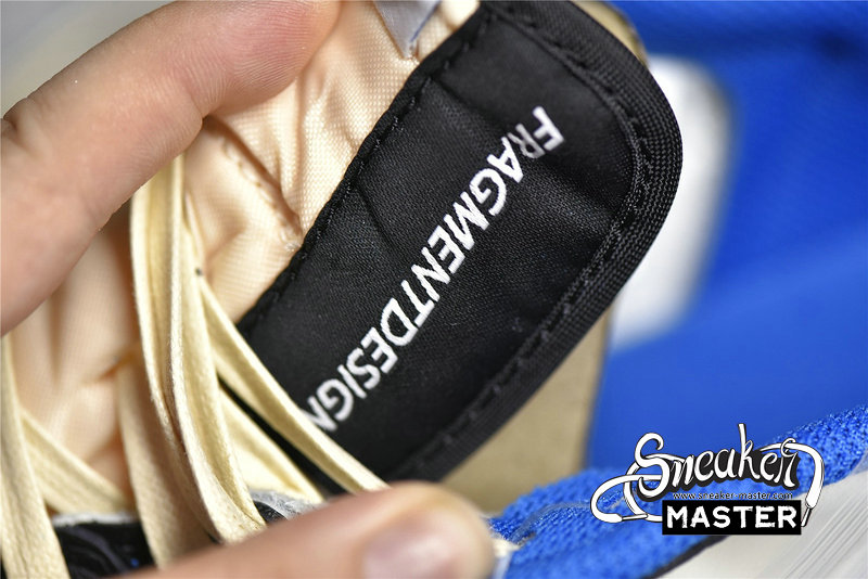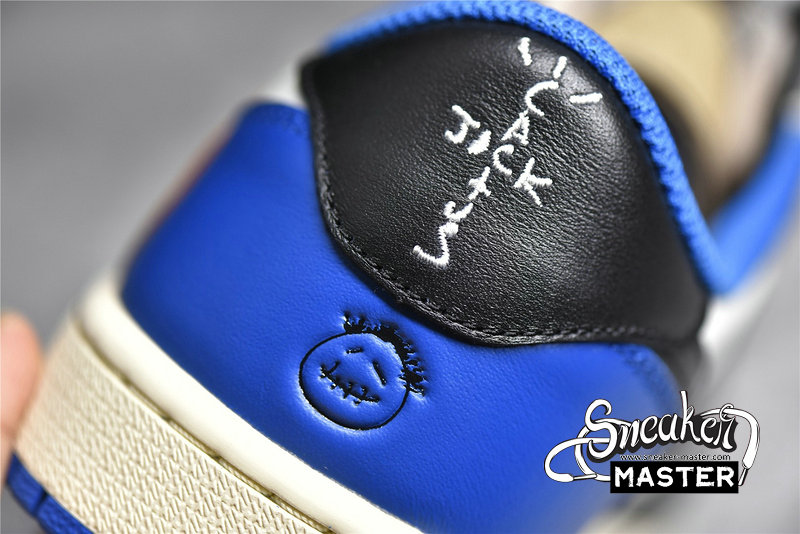 - The Fragment Design x Travis Scott x Air Jordan 1 Retro Low released as part of a collaboration with the Houston rapper and Japanese imprint. Featuring a colorway that recalls previous fragment design collaborations, the shoe's upper is built with a white leather base, overlaid by black and royal blue and complemented by inverted Swoosh branding on the lateral side. The heel patch of the left shoe includes Cactus Jack branding and a smiley face logo, while fragment's lightning bolt marks the right shoe. Underfoot, a two-tone rubber cupsole anchors the design.