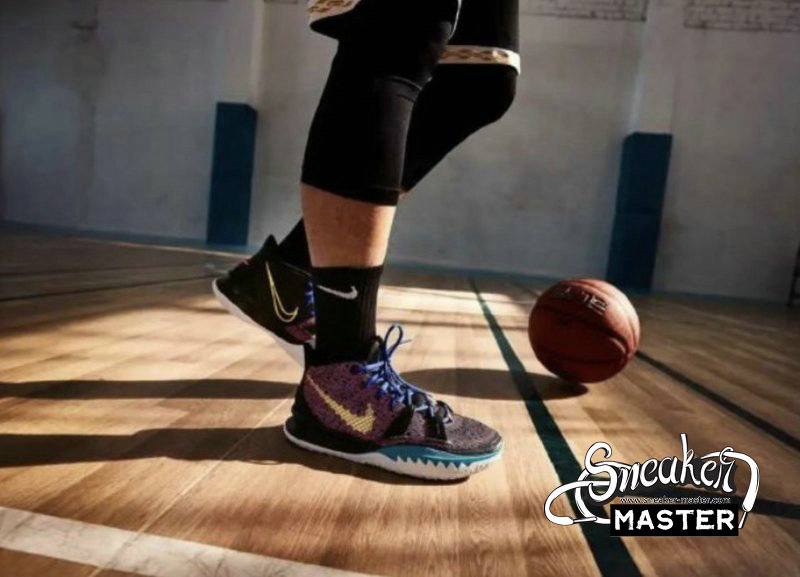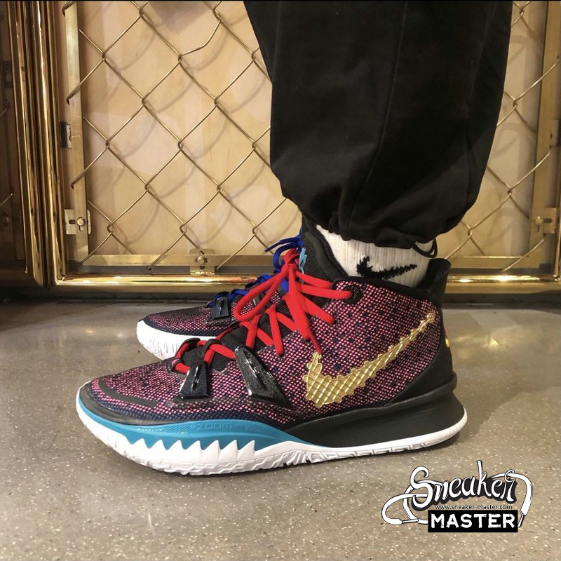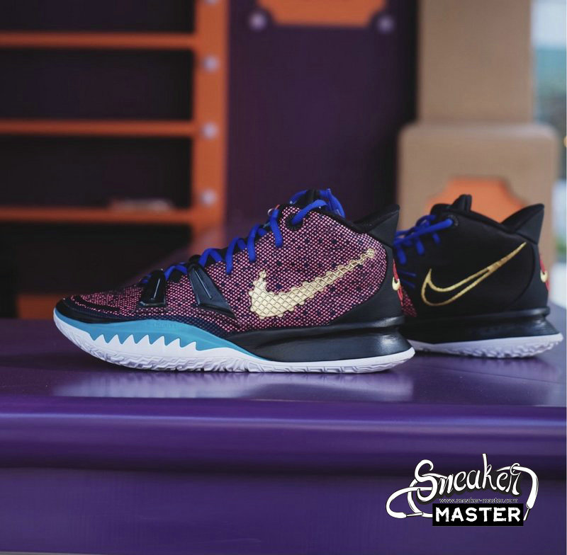 - This offering of the Nike Kyrie 7 features a Pink printed upper paired with Blue laces and Teal tongue branding and lateral forefoot overlays on the White midsole. Highlighting the shoe is a Gold sculpted ornate-like Swoosh logo on the lateral with embroidery branding appearing on the heels. A White rubber sole with a bold Red Kyrie logo completes the design.