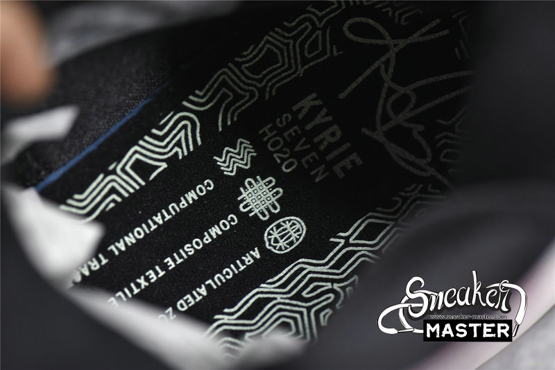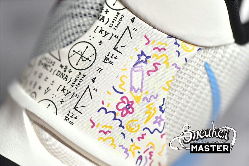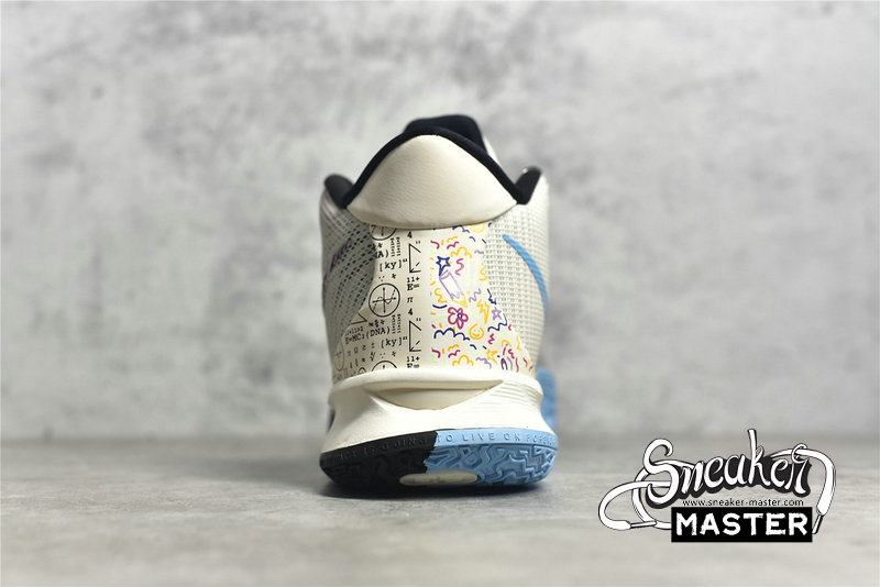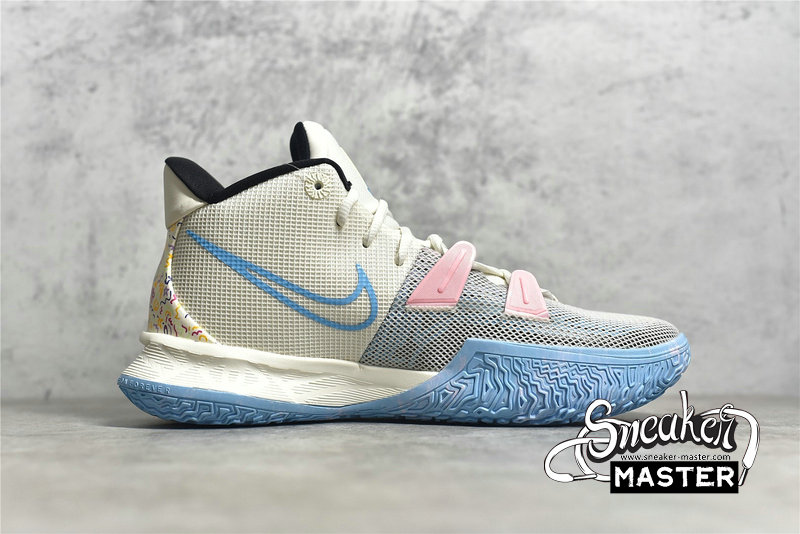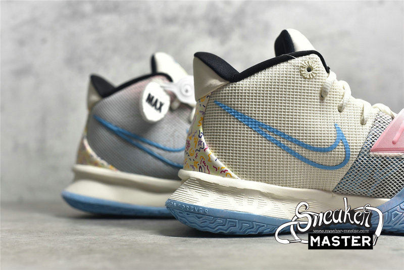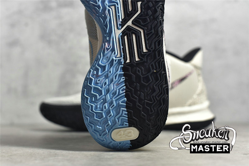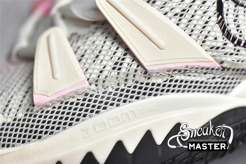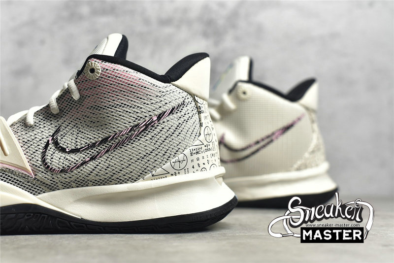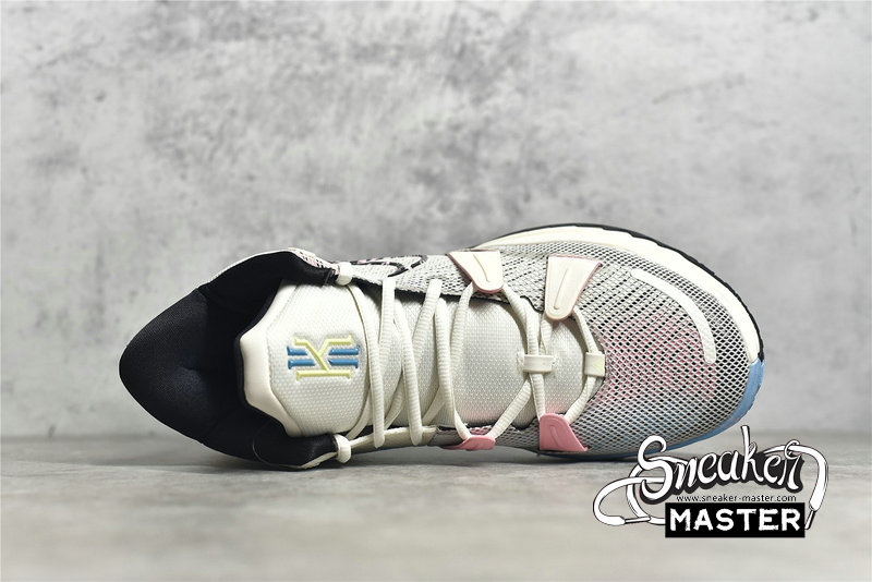 - The Kyrie 7 EP 'Pale Ivory' features a neutral mix hues and a unique design on its performance basketball construction. The shoe's upper is built with a mix of mesh and a textile inlay, which sports a series of swirling pastel color. The lateral side includes a pink and black Swoosh, with the lateral side sporting a printed blue Swoosh. The split construction continues onto the heel overlay, which includes a mix of equations and colorful doodles, while the rubber outsole, similiarly split, is built with durable rubber for outdoor play. Air Zoom Turbo in the forefoot of the phylon midsole provides cushioning.
