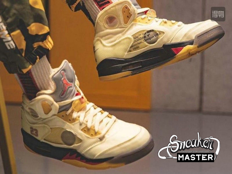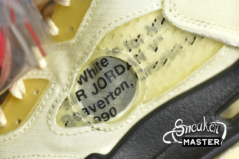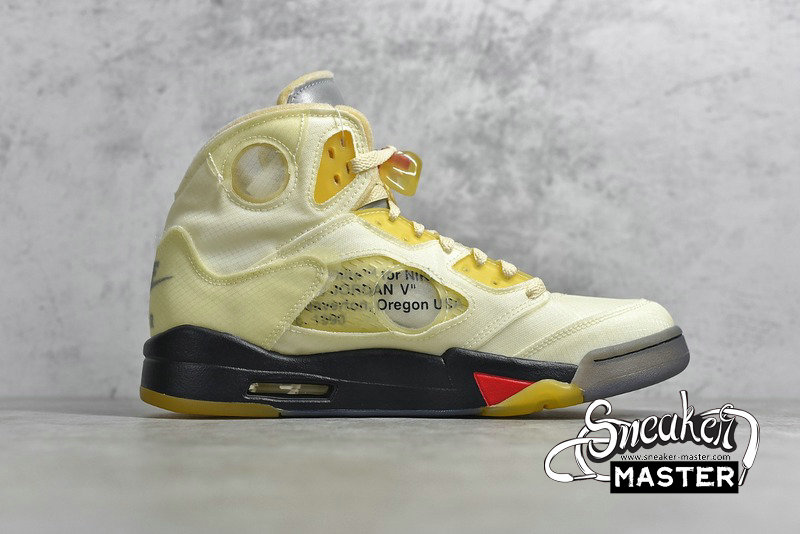 - Jordan Brand teamed up with Virgil Abloh's luxury streetwear label to create the Off-White x Air Jordan 5 Retro 'Fire Red' in October 2020. A follow-up to an early 2020 Air Jordan 5 collaboration, the shoe's upper features an off-white textile construction, with the midfoot, collar and reflective silver tongue sporting circular cutouts. Helvetica text marks the medial side, while underfoot, a contrasting black midsole houses Air in the heel for cushioning. A pre-yellowed finish on the outsole, which provides traction, completes the look.
