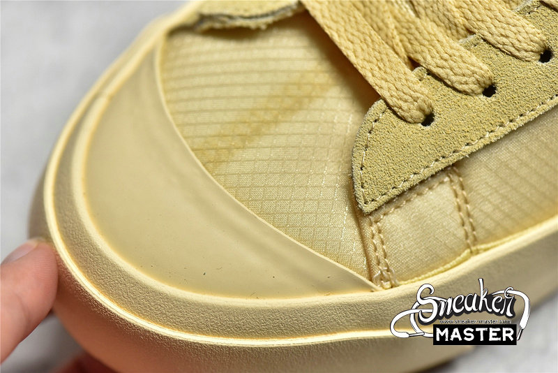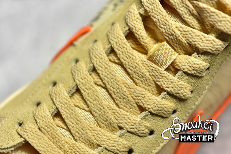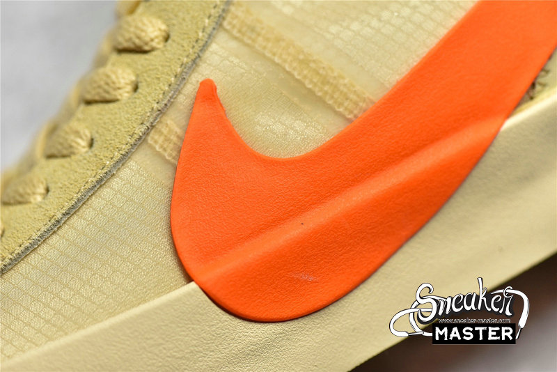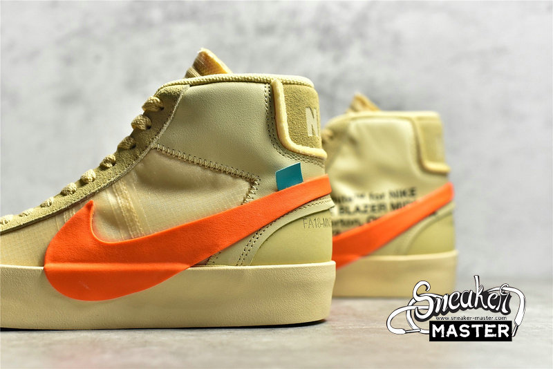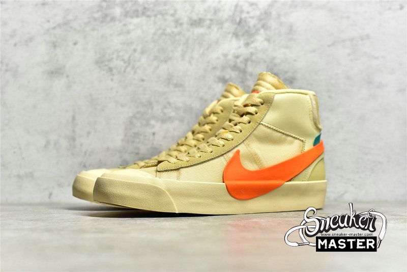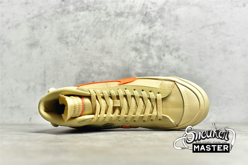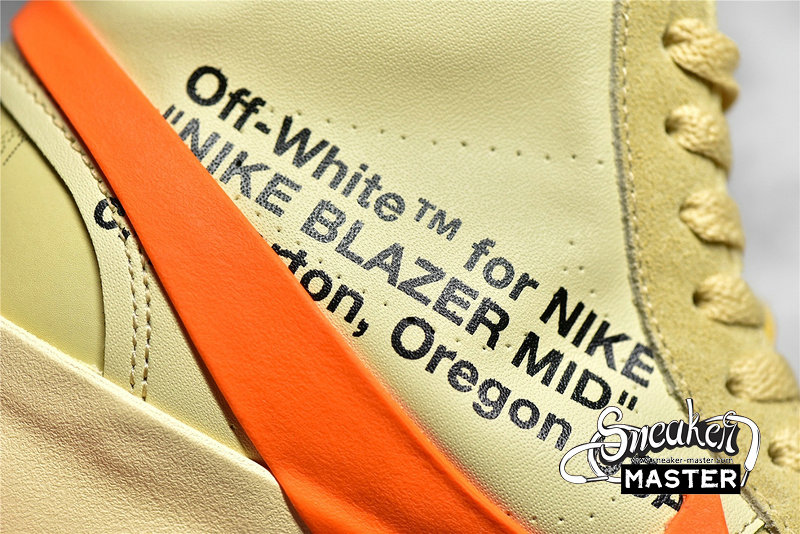 - The OFF-WHITE x Blazer Mid ‘All Hallows Eve’ showcases a seasonally appropriate orange Swoosh across a Pale Vanilla upper. The yellowish-tan color extends to the exposed-foam tongue and rubber midsole, with the signature zip tie in blue adding a contrasting burst of color. Virgil Abloh’s signature lines of text crop up on the medial-side quarter panel.