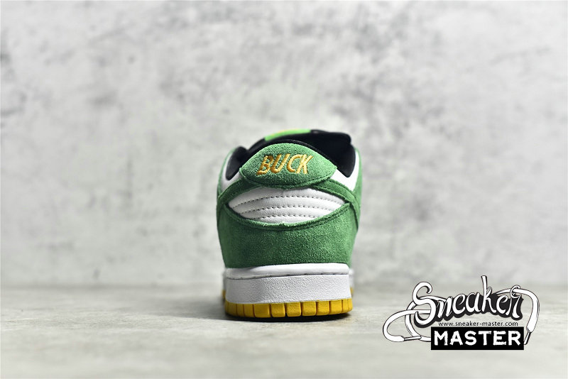 - The Dunk Low Pro SB ' Buck ' pays homage to Phil Knight, Nike's co-founder, whose alma mater, the University of Oregon, inspires the green and yellow colorway of the shoe. The heel tag displays a ' Buck ' name embroidery, a surname that stuck from infancy to university with Knight.