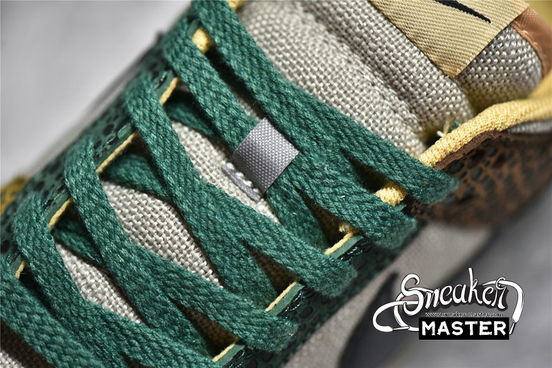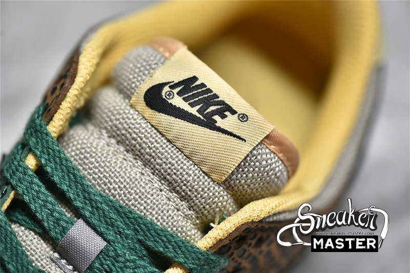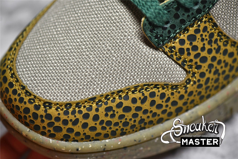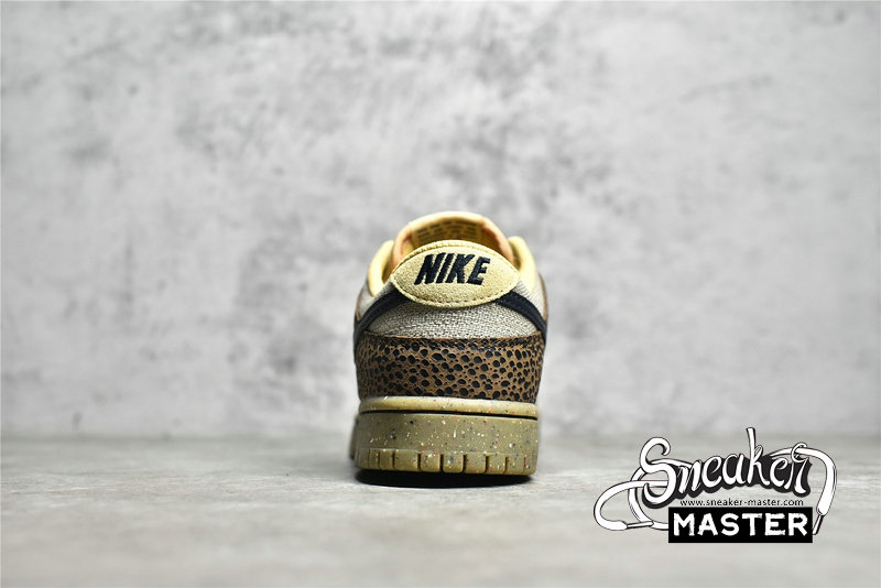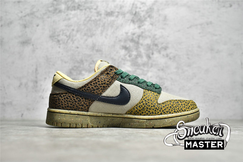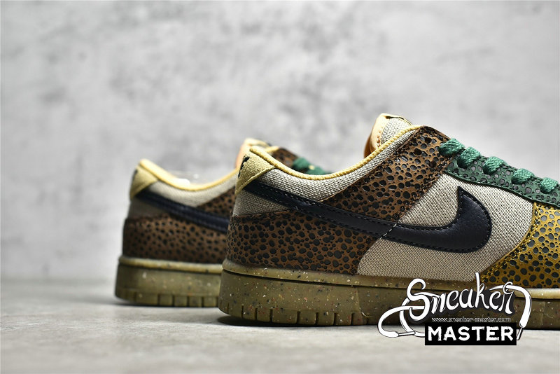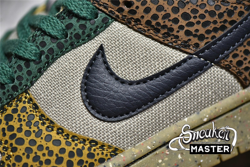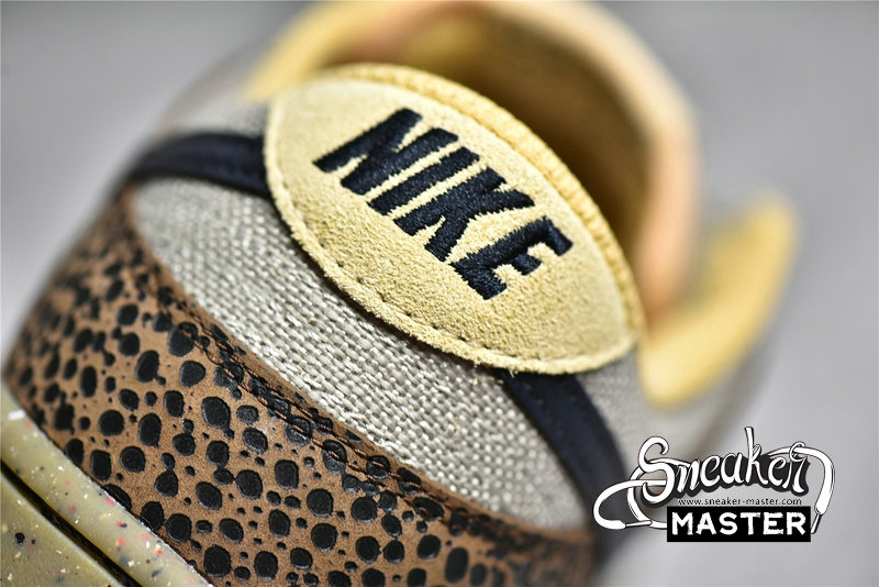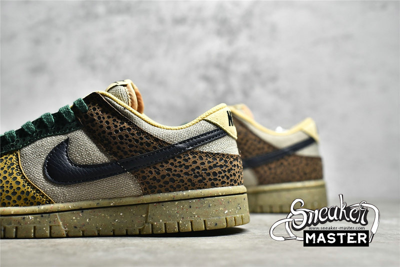 - This offering of the Nike Dunk Low comes constructed with a hemp mesh base and tongues, safari print overlays, leather Swooshes, and suede heels. A Gum Grind Rubber speckled sole unit completes the design.