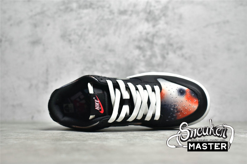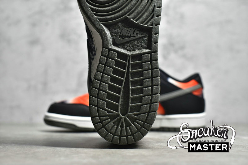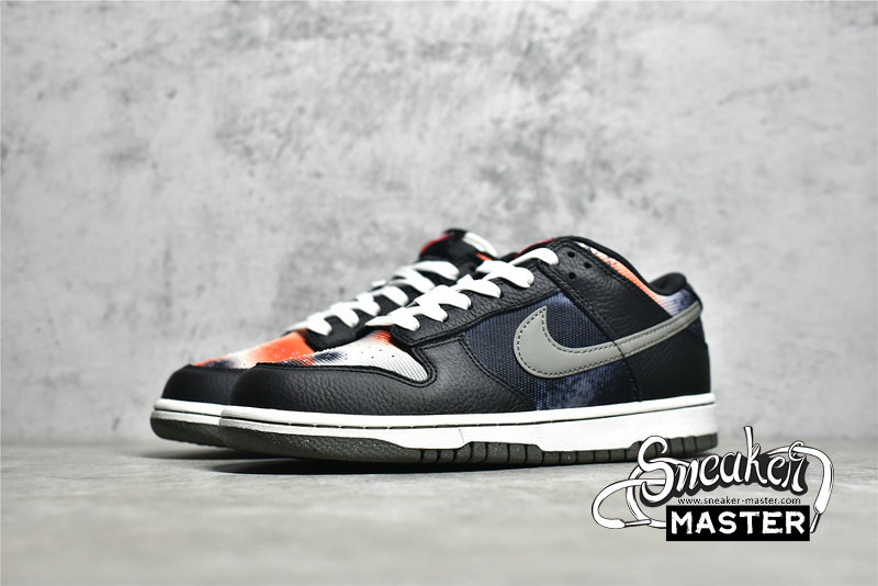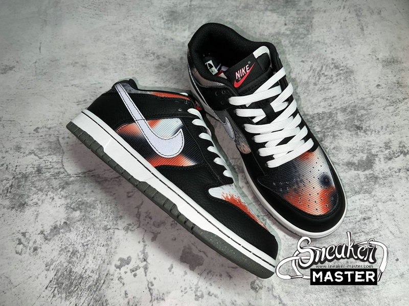 - This offering of the Nike Dunk Low features a spray paint design covering its canvas base in a mix of Red, Grey, Black, and White. Other details includes Black leather overlays and Silver 3M reflective Swooshes. Grind Rubber outsole with graffiti-styled insoles and box completes the design.