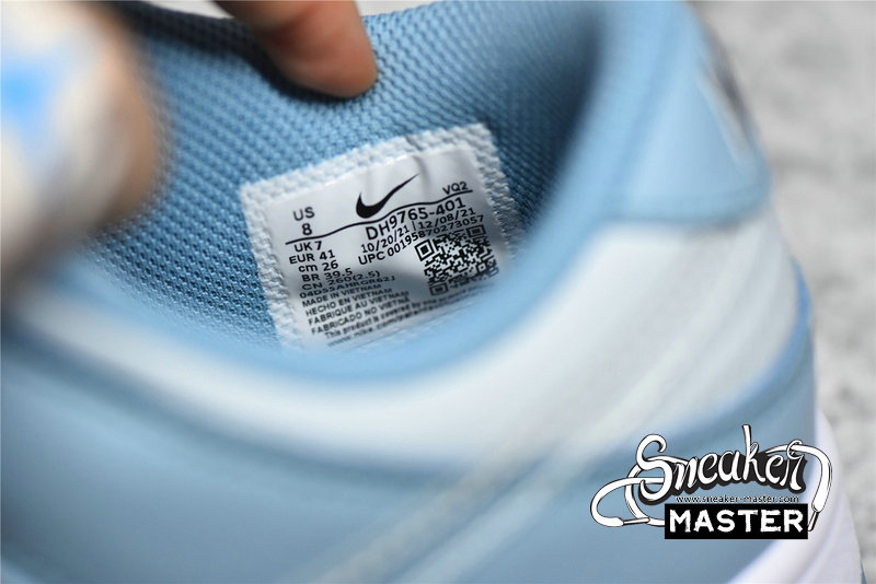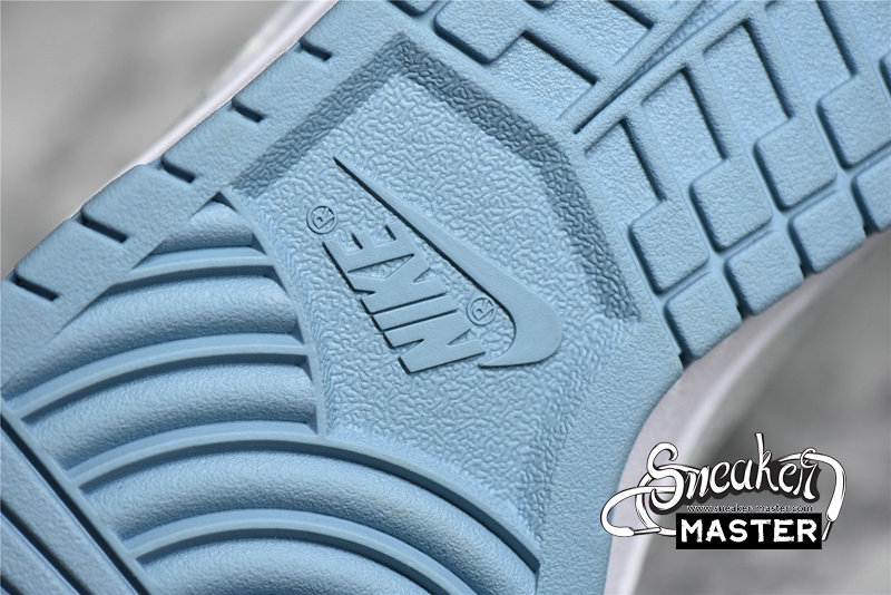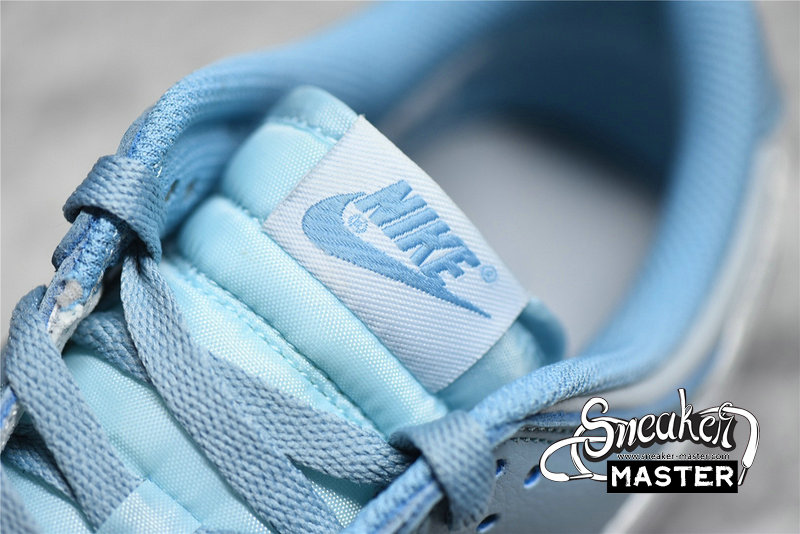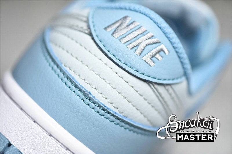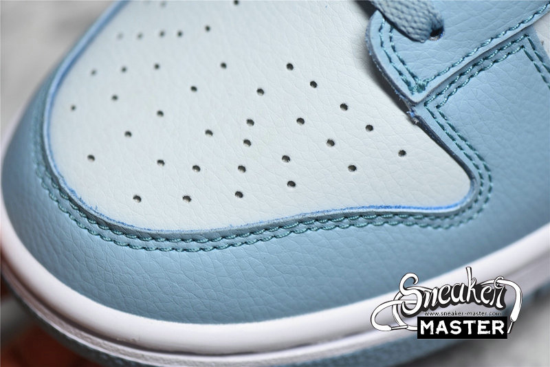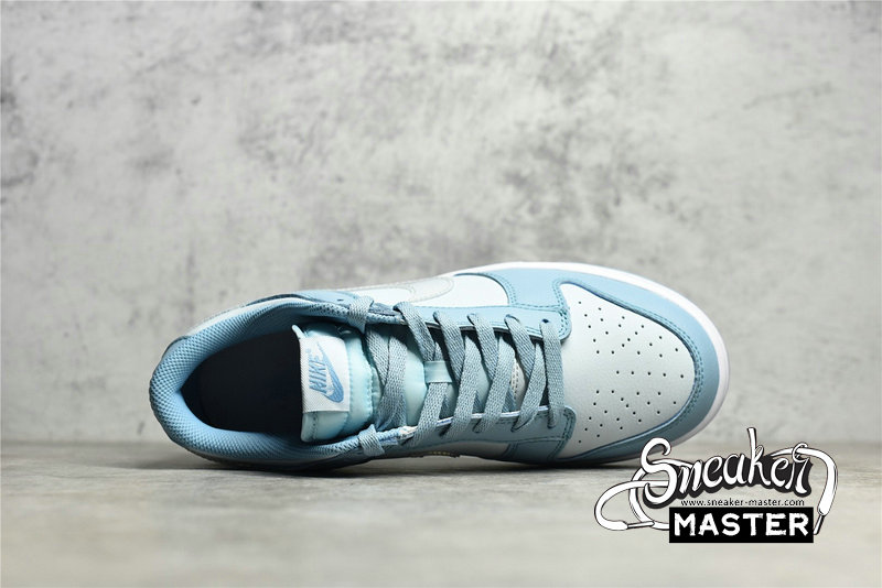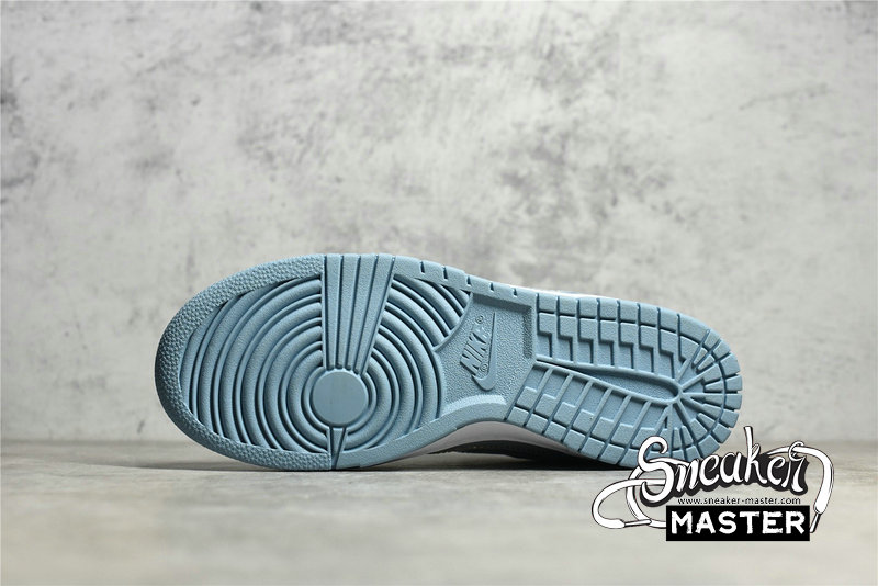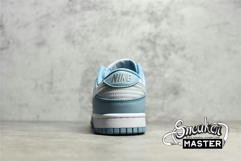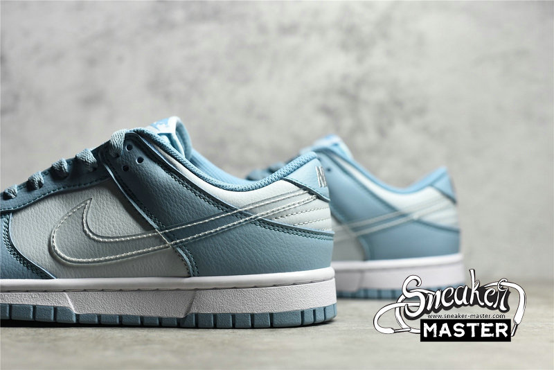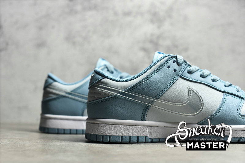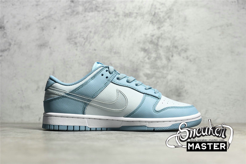 - This Nike Dunk Low starts off with a light grey leather on the base of the upper which is then contrasted by a light blue placed on the overlays. The defining characteristic on this Dunk Low comes on the branding where we see clear Swooshes placed on both side panels. Grey embroidered Nike branding on the heels, white rubber midsoles, and the same shade of blue on the rubber outsoles finish off the look on this Nike DunK Low.