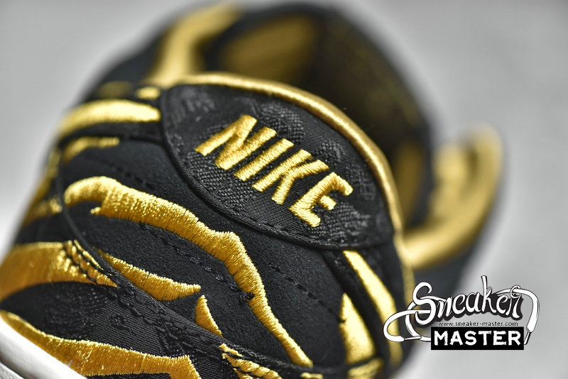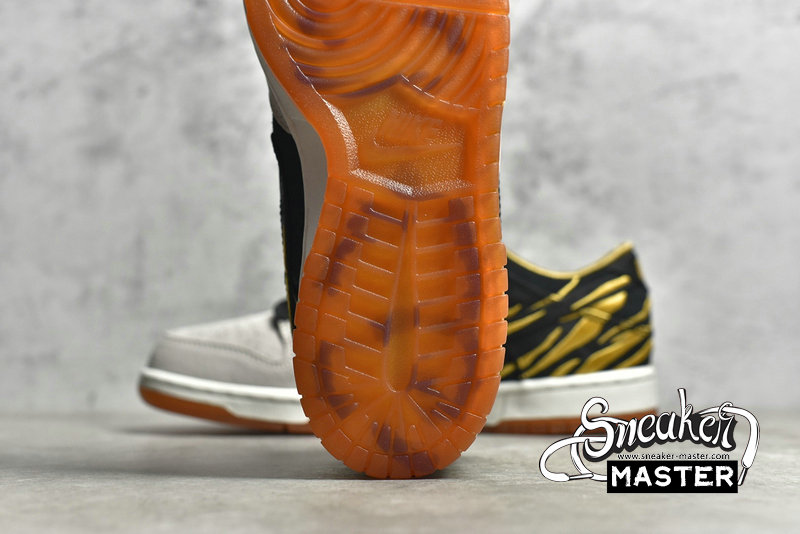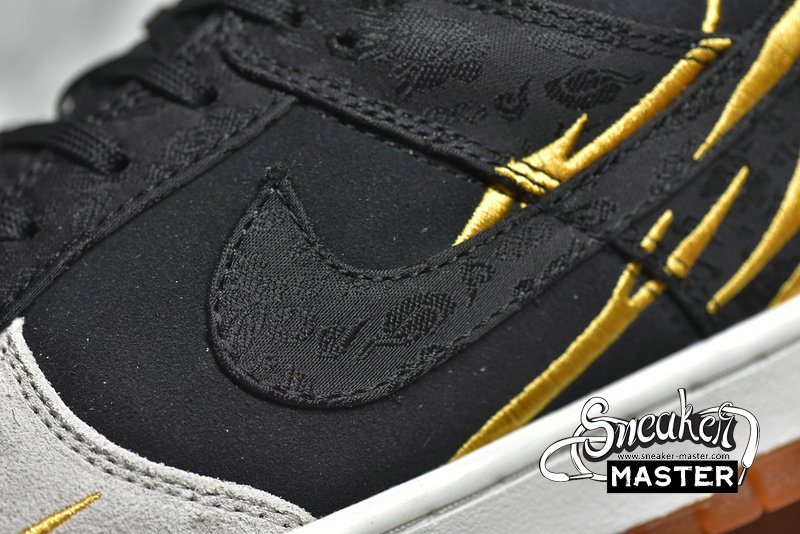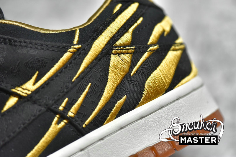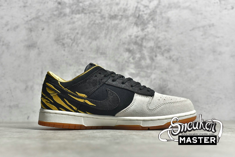 - In celebration of the new lunar year is the NIke Dunk Low GS 'God of Wealth.' Made for older kids in a China-exclusive release, its' upper features amber stripes embroidered the rear portion, which is lined in gold satin and built with grey and black suede. A matching black finish is applied to patterned brocade fabric used on the eyetstay, Swoosh, and heel overlay. It's built on a rubber cupsole that pairs white sidewalls with an orange translucent outsole marked with black tiger stripes.