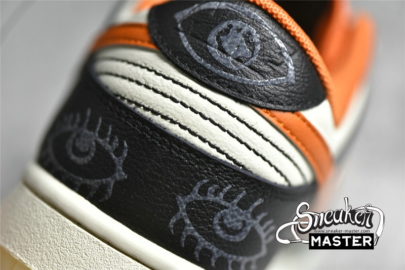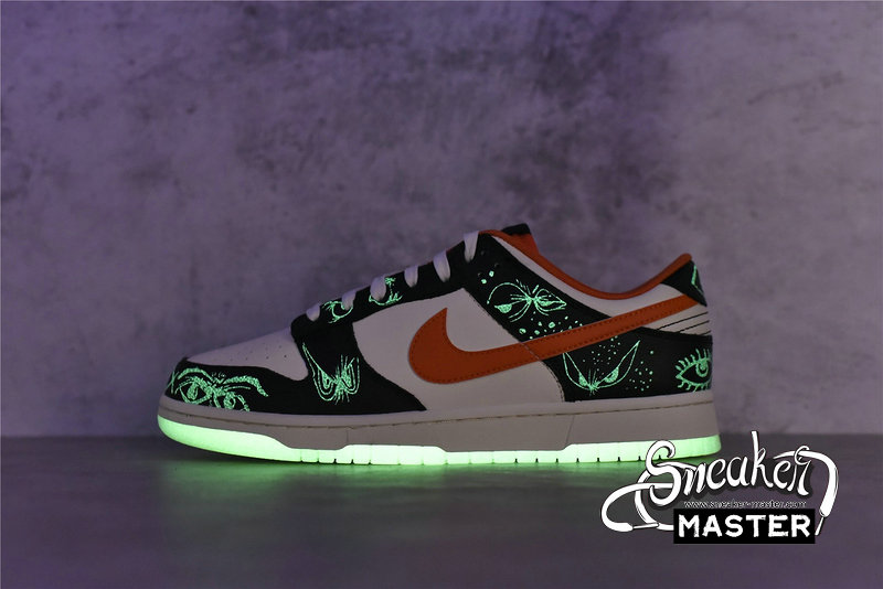 - This Nike Dunk Low features a Sail leather upper with Orange Swooshes, tongues, and inner lining. Highlighting the shoe is its Black overlay detailed with glow-in-the-dark owl eyes atop a Sail midsole and glowing outsole.