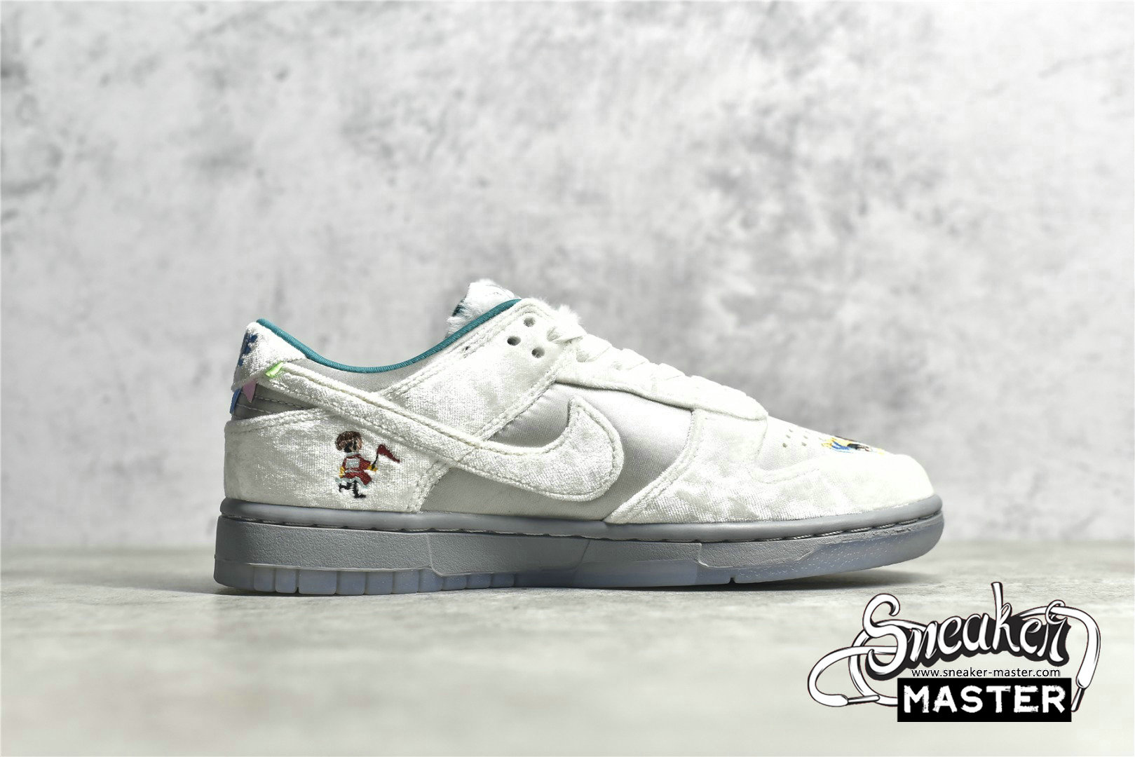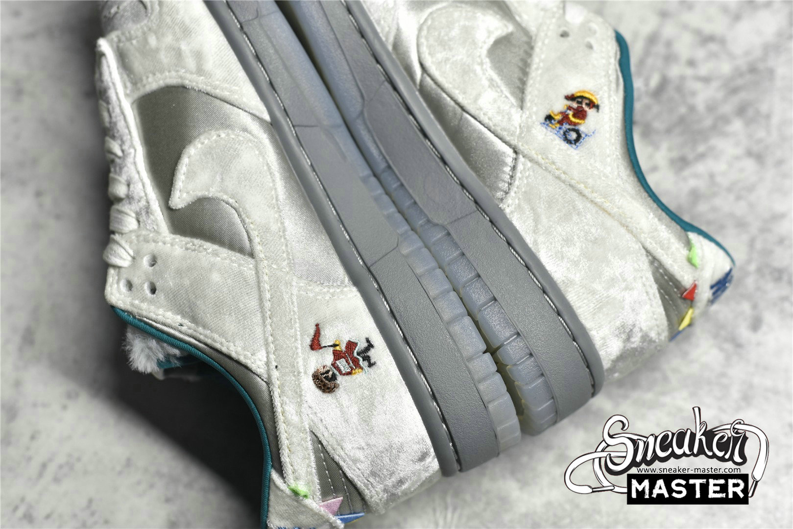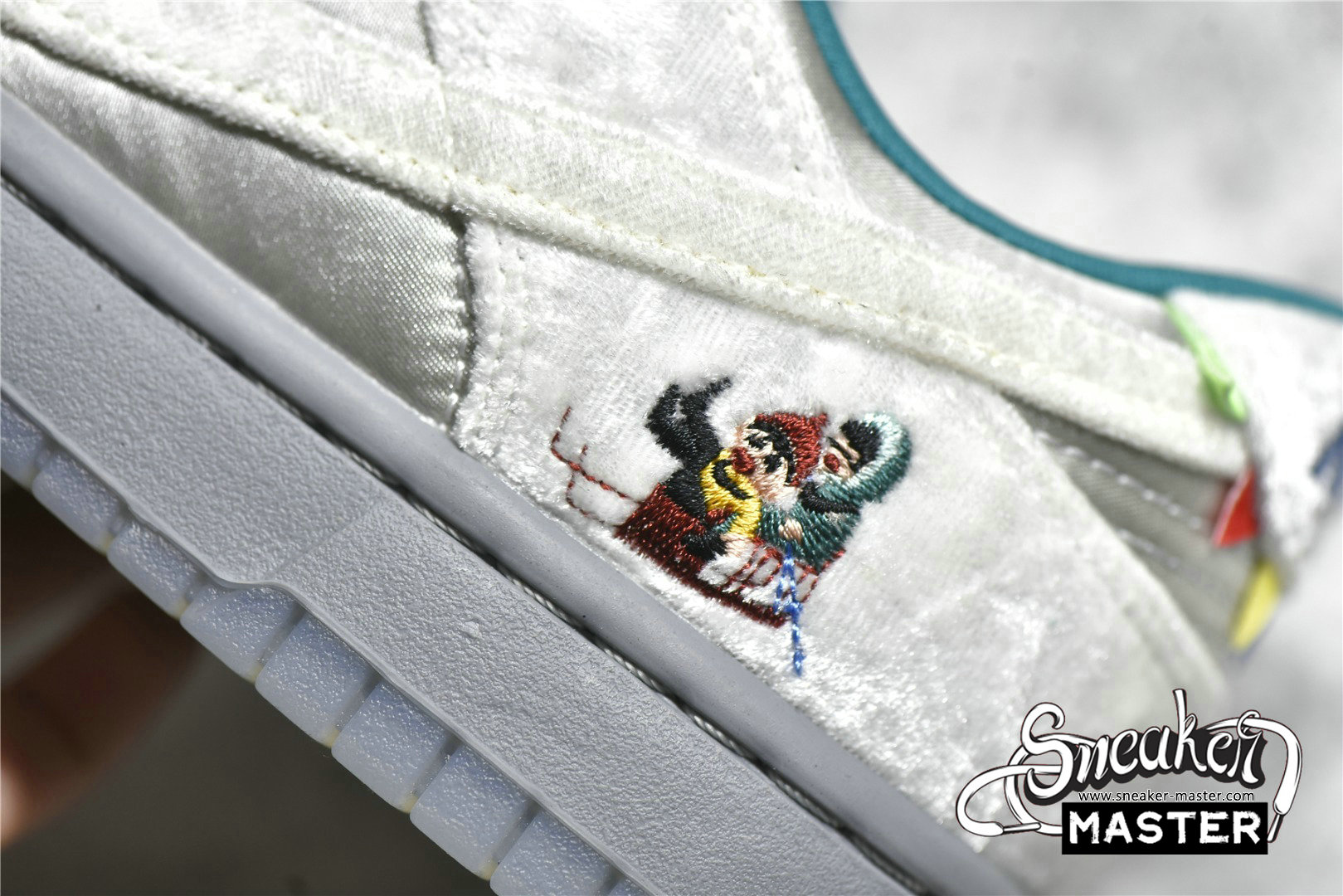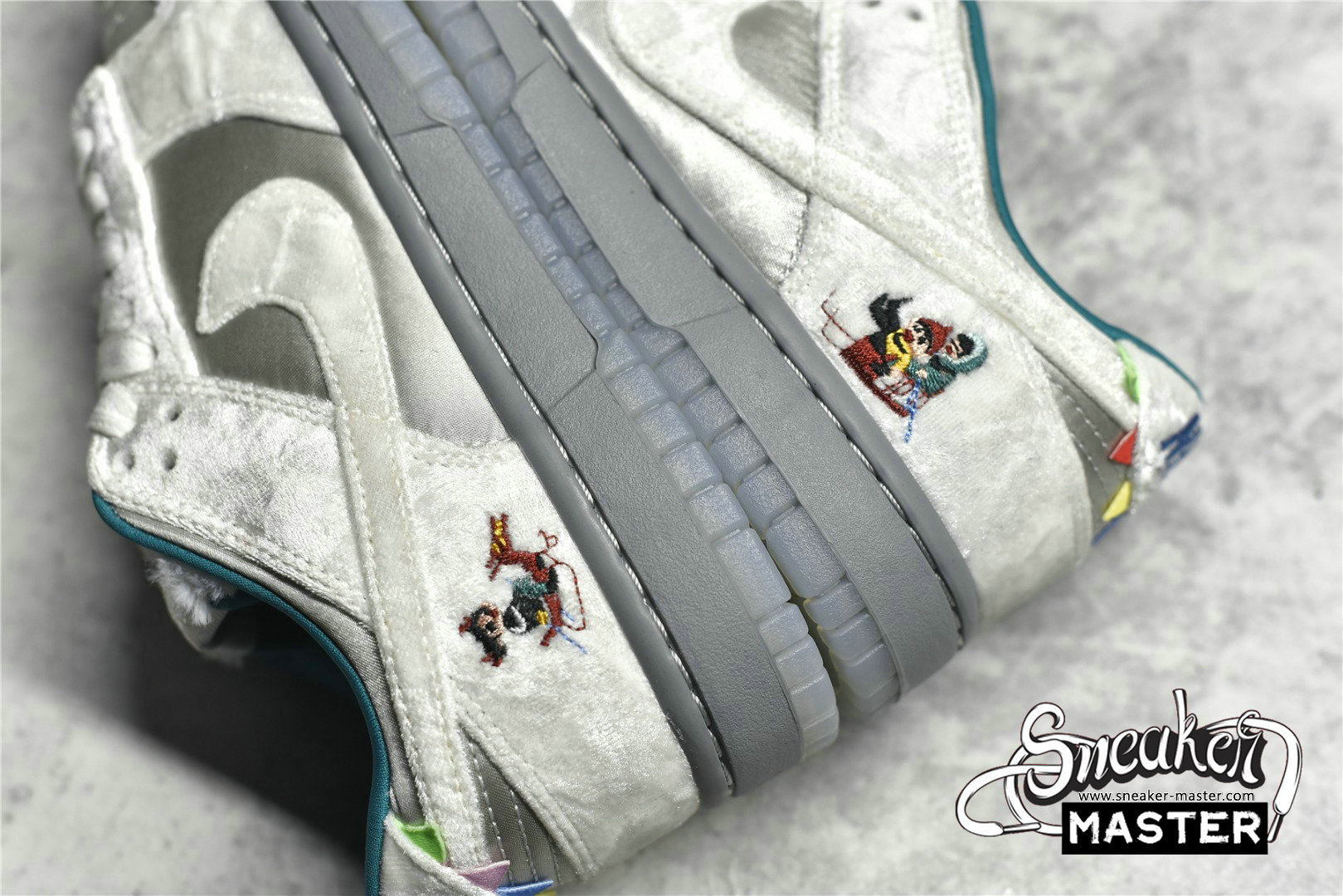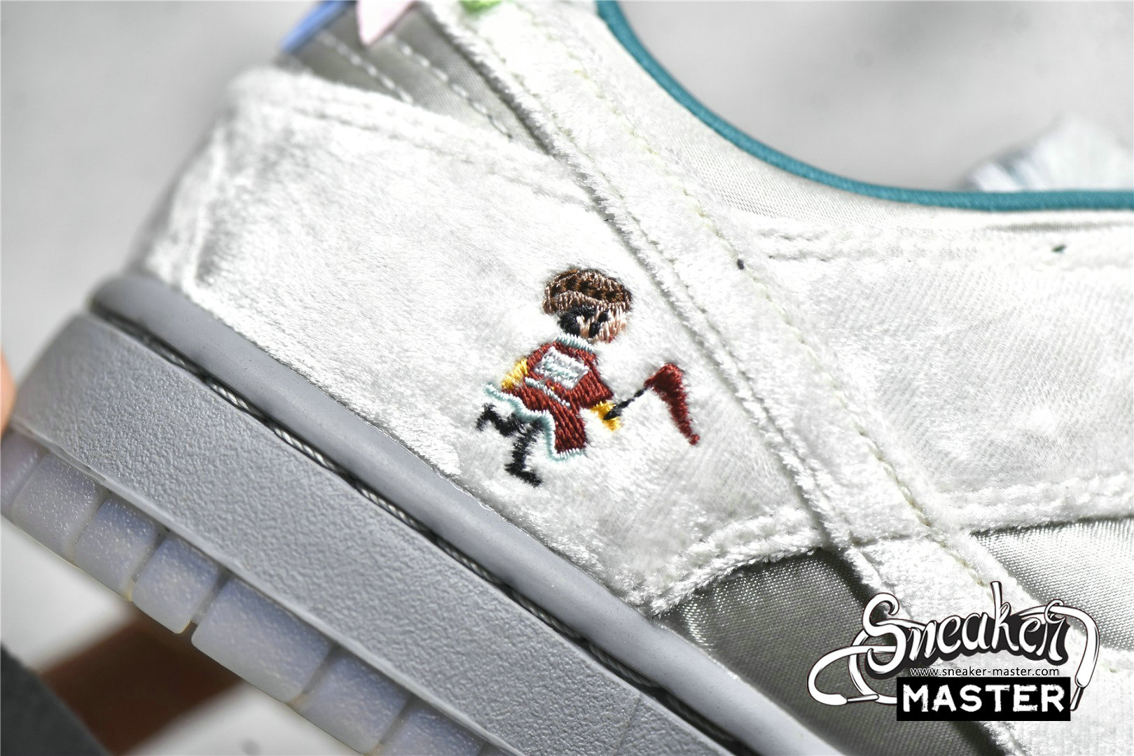 - This offering of the Nike Dunk Low Grey satin base with matching velvet overlay panels. Other details include embroidery of children playing in the snow featured on the heel counter and left toe box while the text reading “Ice” in Chinese appears on the insole. Colorful flags on the heel, fur tongues, Blue stain sockliner atop a Grey midsole and icy translucent outsole covered in snowflakes completes the design.