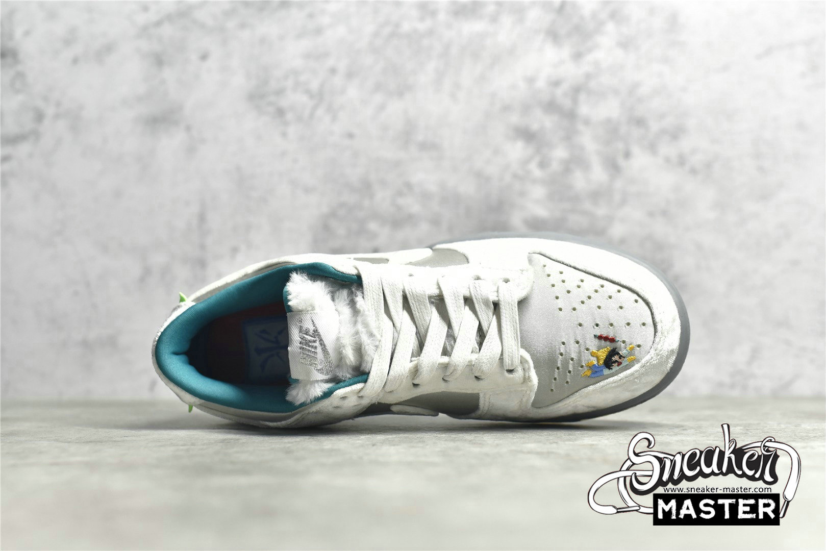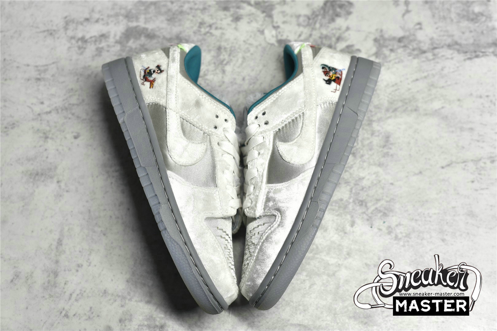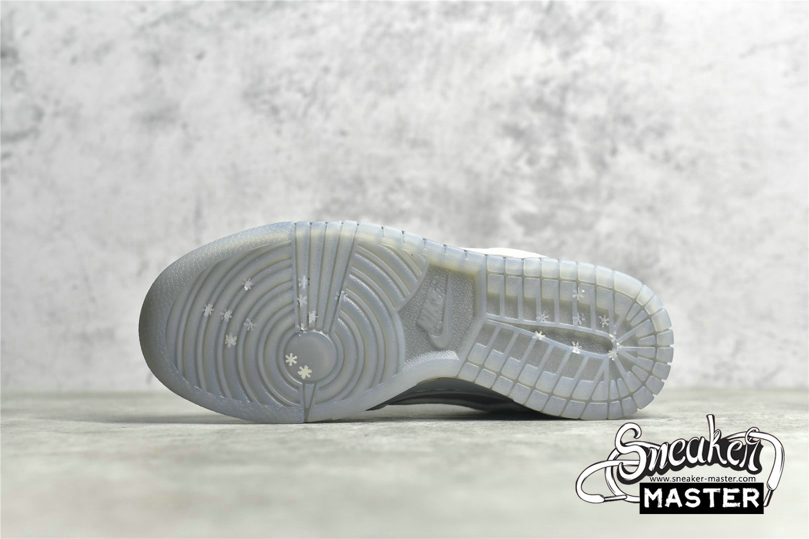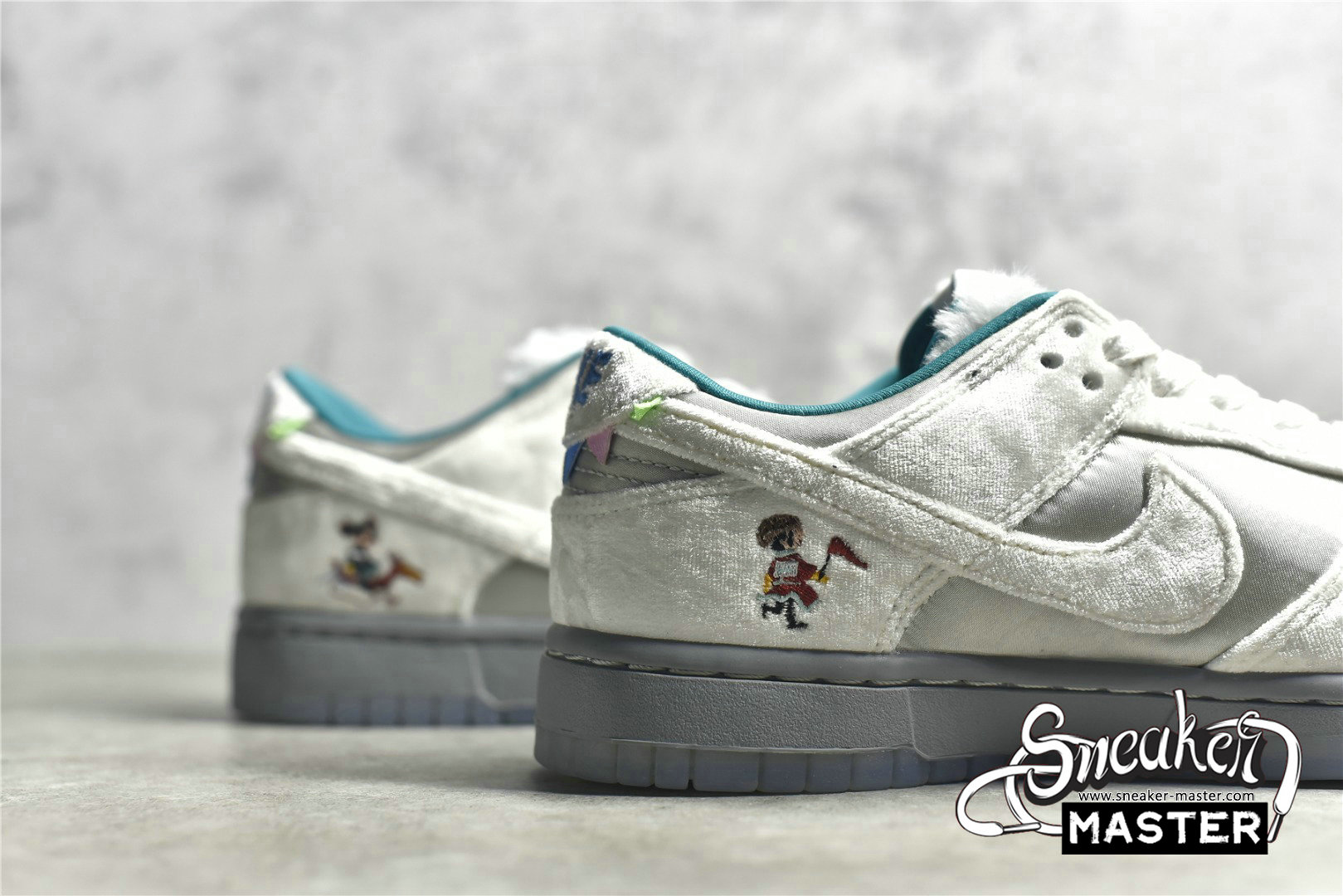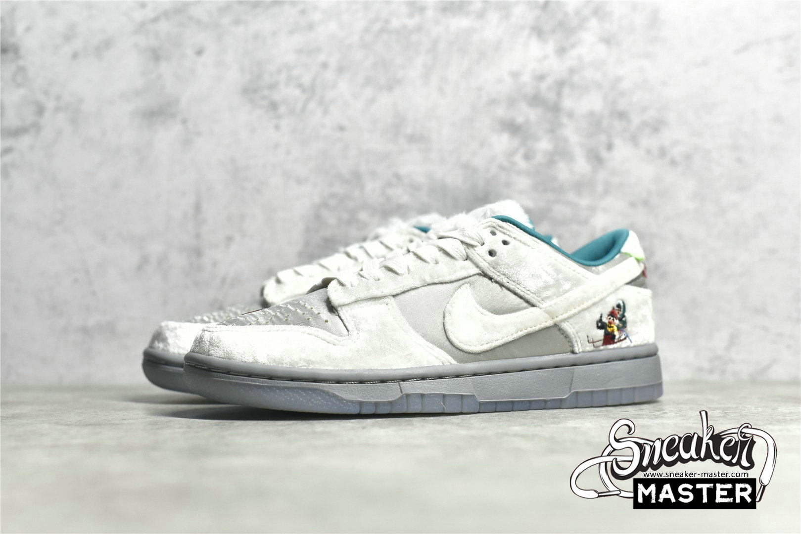 - This offering of the Nike Dunk Low Grey satin base with matching velvet overlay panels. Other details include embroidery of children playing in the snow featured on the heel counter and left toe box while the text reading “Ice” in Chinese appears on the insole. Colorful flags on the heel, fur tongues, Blue stain sockliner atop a Grey midsole and icy translucent outsole covered in snowflakes completes the design.