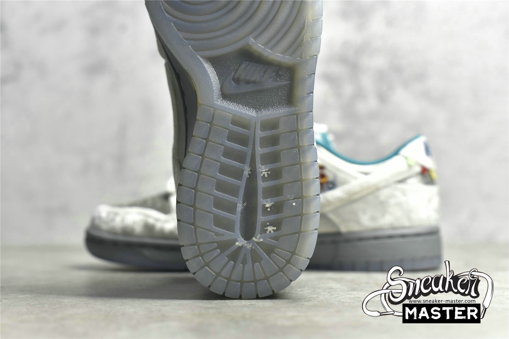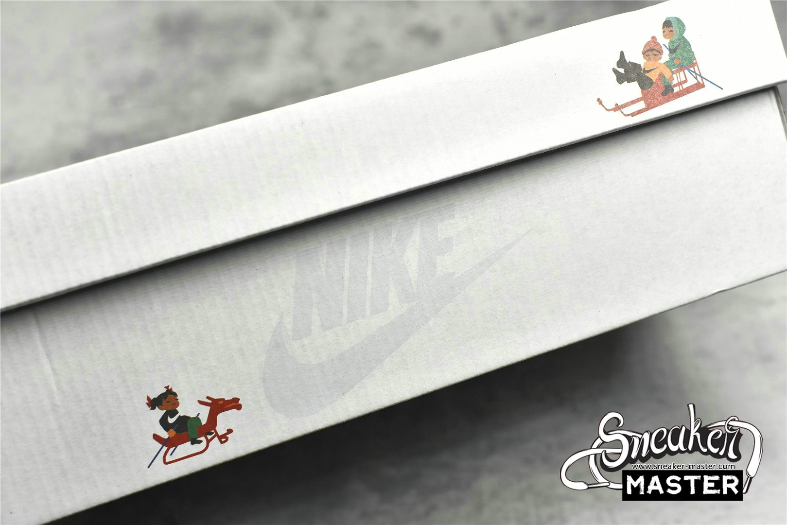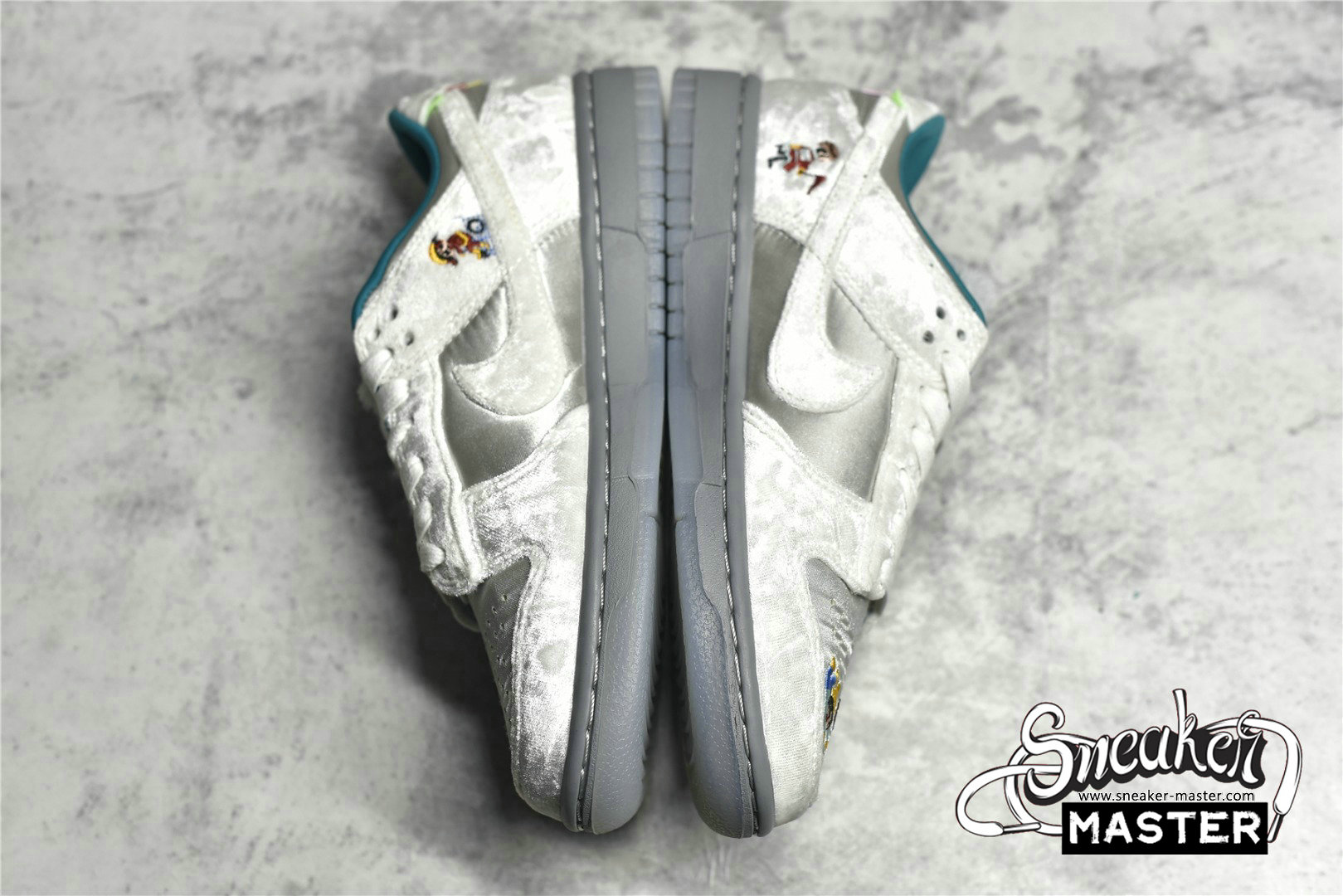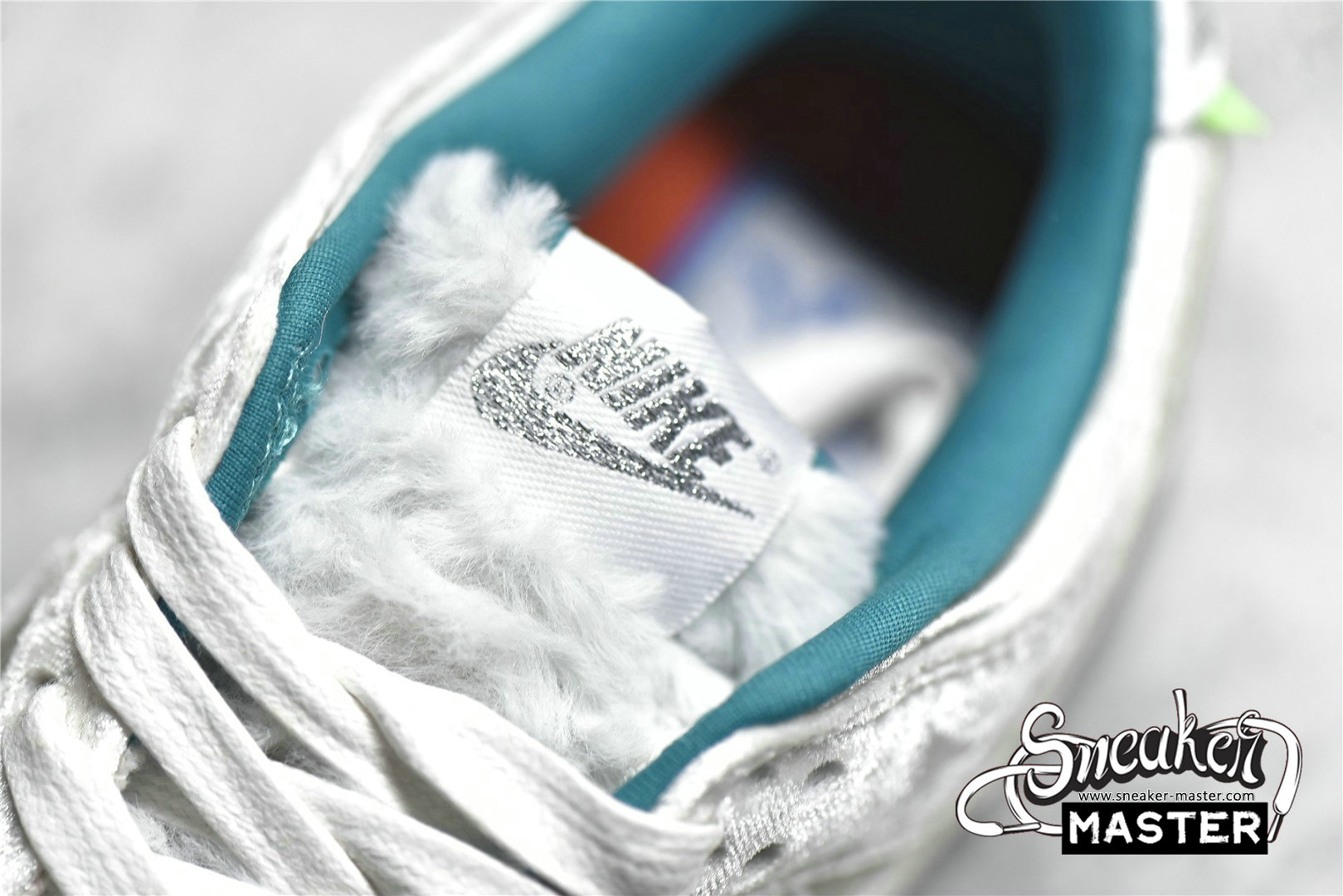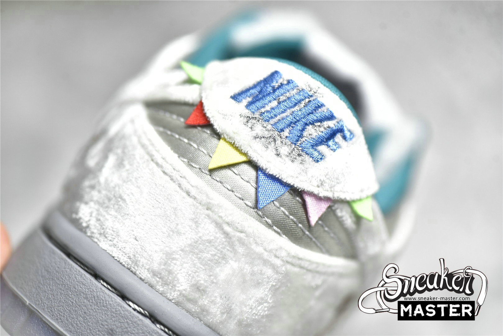 - This offering of the Nike Dunk Low Grey satin base with matching velvet overlay panels. Other details include embroidery of children playing in the snow featured on the heel counter and left toe box while the text reading “Ice” in Chinese appears on the insole. Colorful flags on the heel, fur tongues, Blue stain sockliner atop a Grey midsole and icy translucent outsole covered in snowflakes completes the design.