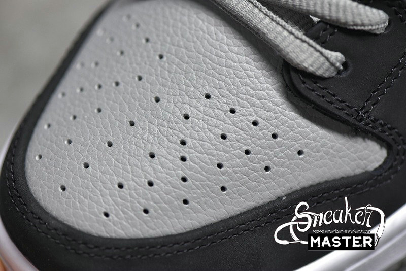 - This Nike SB Dunk Low comes highlighted with Grey tumbled leather across the toe while Black suede lands on the overlays. In addition we have Black tumbled leather on the panels and ankle collar while Grey suede is applied to the Swoosh logos. Other highlights includes Grey on the laces, Black mesh across the tongue, White on the midsole and a Grey rubber outsole.