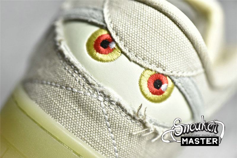 - This Dunk options frayed, tear-away canvas development that mimics mummy wraps and opens to disclose eye embroidery on the heels. Further particulars embrace Seafoam Swooshes, spider embroidery on the left toe, Eye of Horus graphics on the bottom of the tongues, and customized insoles. A glow-in-the-dark outsole brings the theme residence