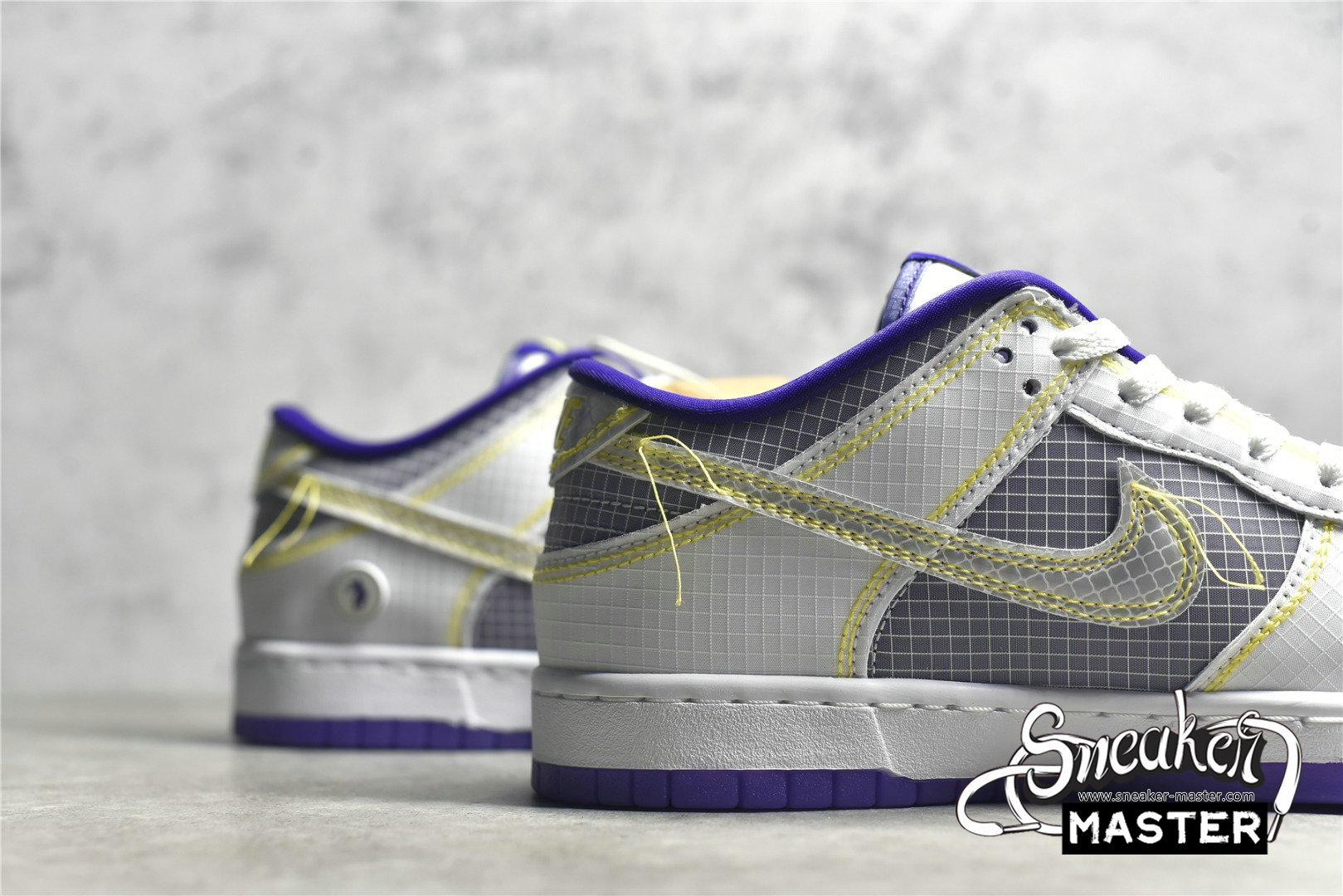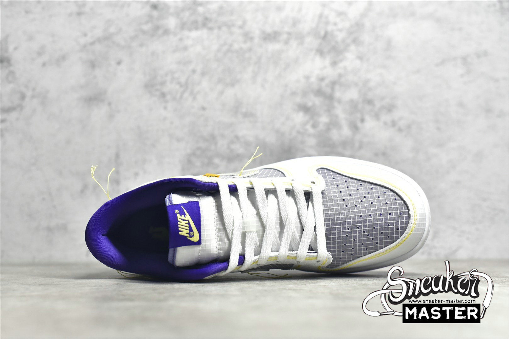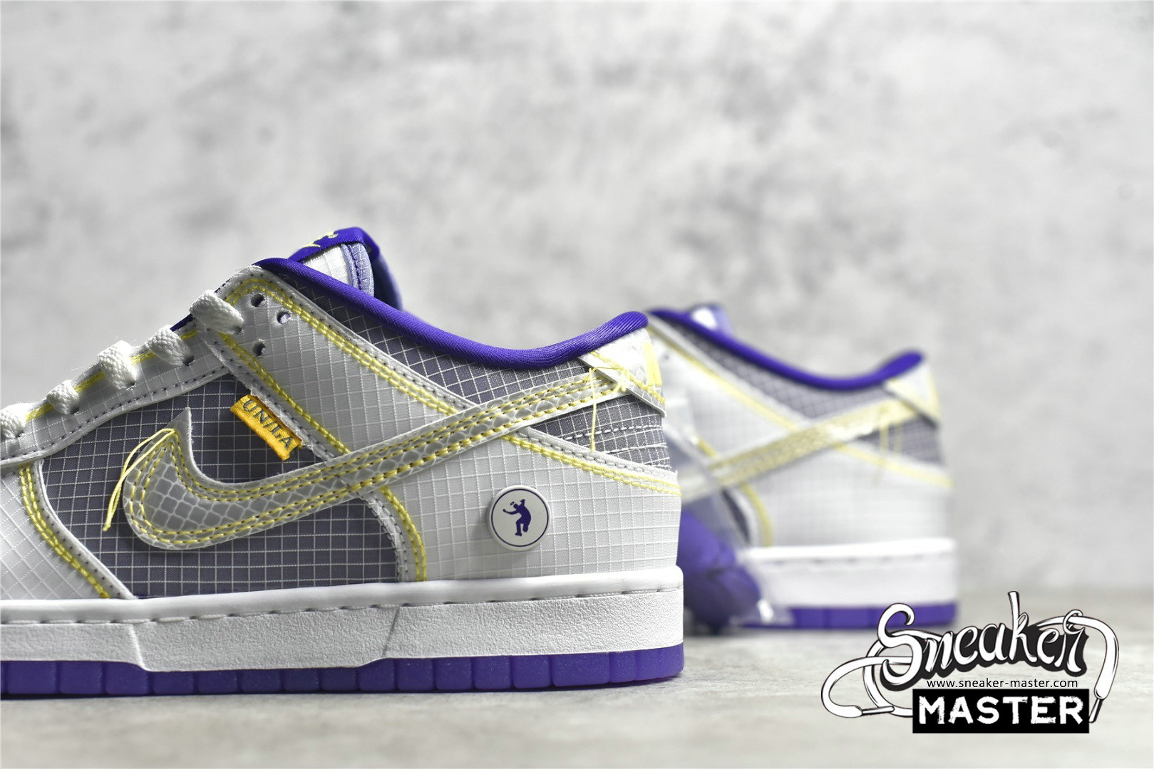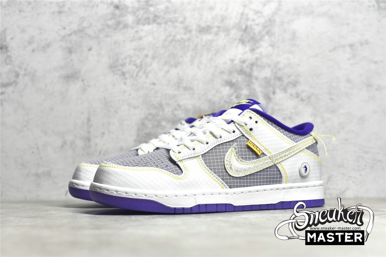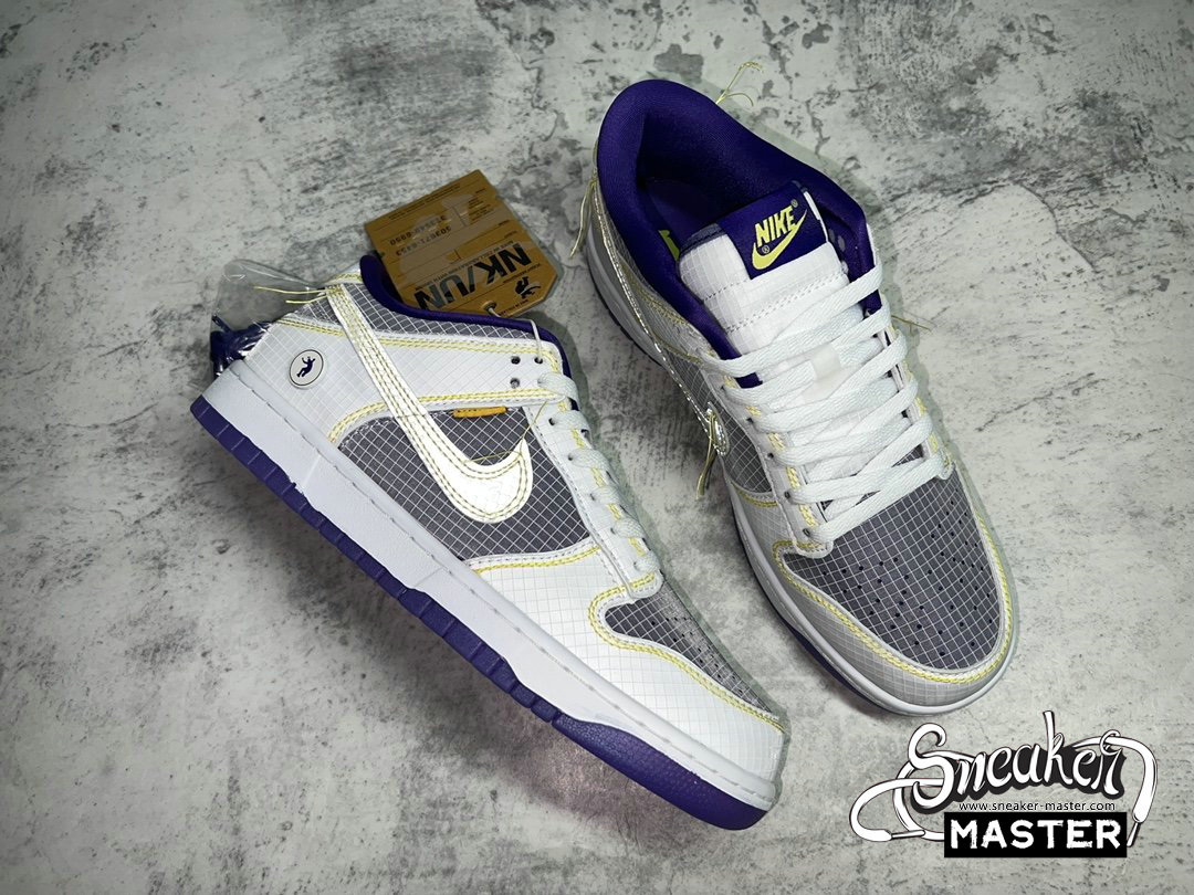 - Showcasing a color combination inspired by Los Angeles' storied NBA franchise is the Union LA x Nike Dunk Low 'Lakers.' The upper is made with semi-translucent ripstop textile that reveals a purple underlay on the toe box, quarter panel and collar. The same gridded design is repeated to the forefoot and heel overlay, rendered in a solid white finish with contrast yellow stitching also applied to the Swoosh with excess hanging threads for a DIY-inspired look. A yellow 'UN/LA' tag decorates the quarter panel, while a circular emblem on the lateral heel displays the OG Frontman logo with the distinctive silhouette making a repeat appearance under the translucent purple rubber outsole.