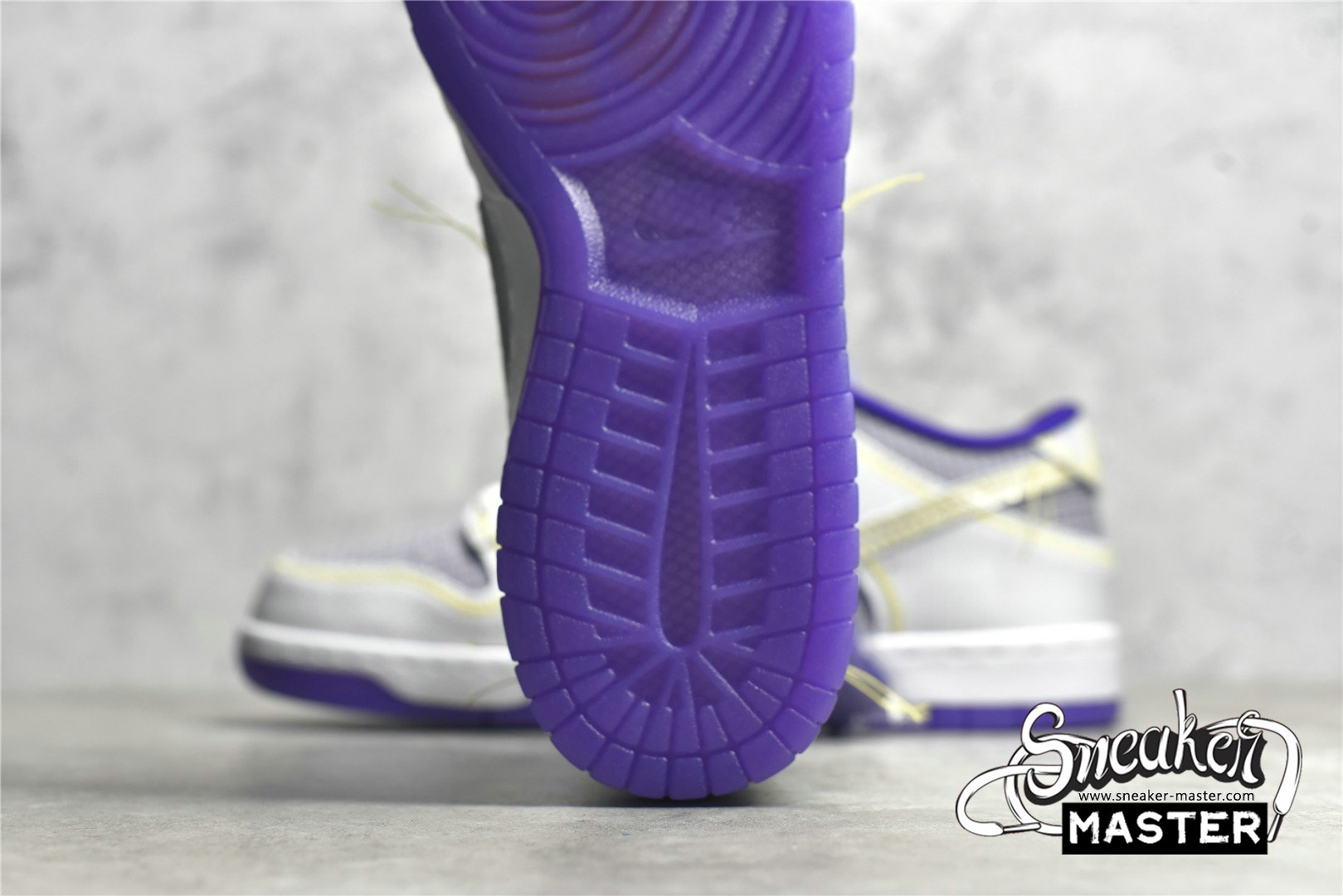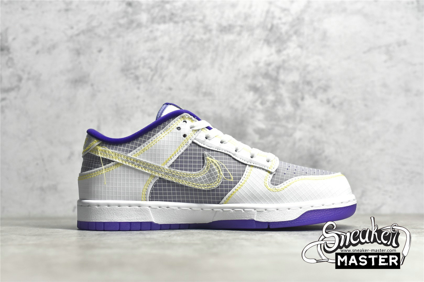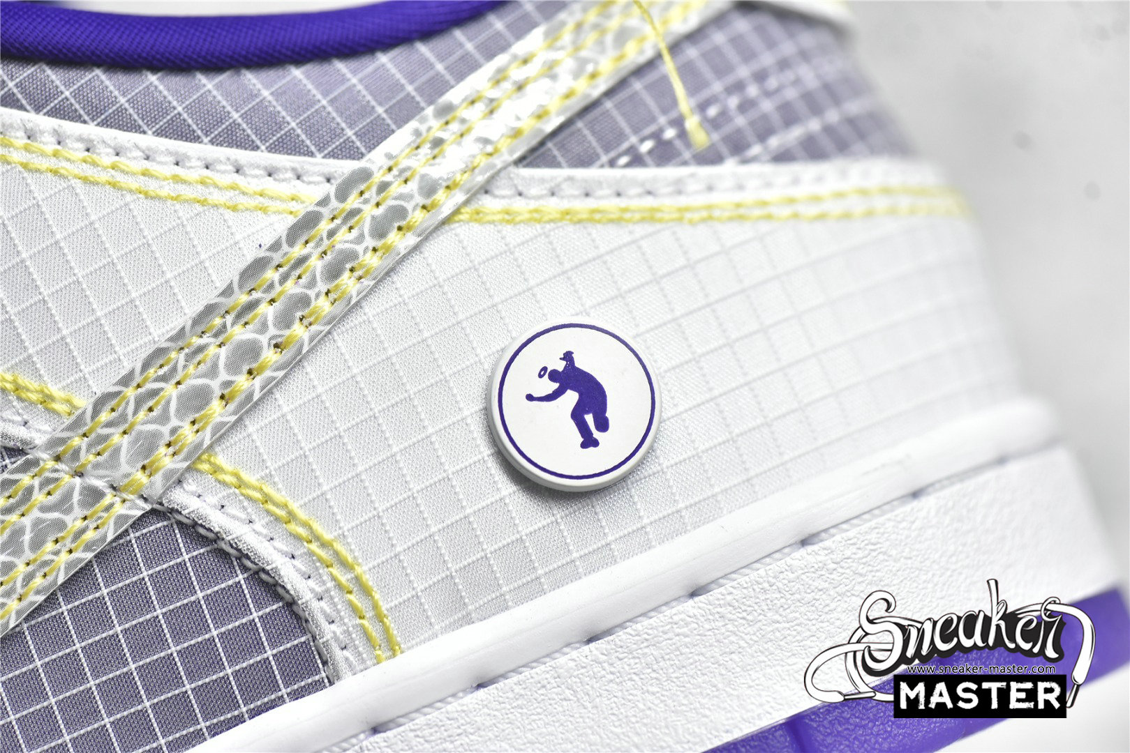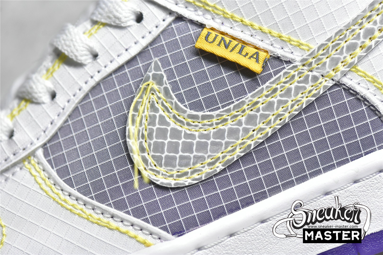 - Showcasing a color combination inspired by Los Angeles' storied NBA franchise is the Union LA x Nike Dunk Low 'Lakers.' The upper is made with semi-translucent ripstop textile that reveals a purple underlay on the toe box, quarter panel and collar. The same gridded design is repeated to the forefoot and heel overlay, rendered in a solid white finish with contrast yellow stitching also applied to the Swoosh with excess hanging threads for a DIY-inspired look. A yellow 'UN/LA' tag decorates the quarter panel, while a circular emblem on the lateral heel displays the OG Frontman logo with the distinctive silhouette making a repeat appearance under the translucent purple rubber outsole.
