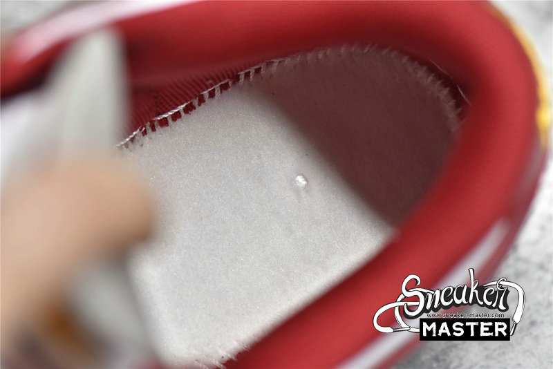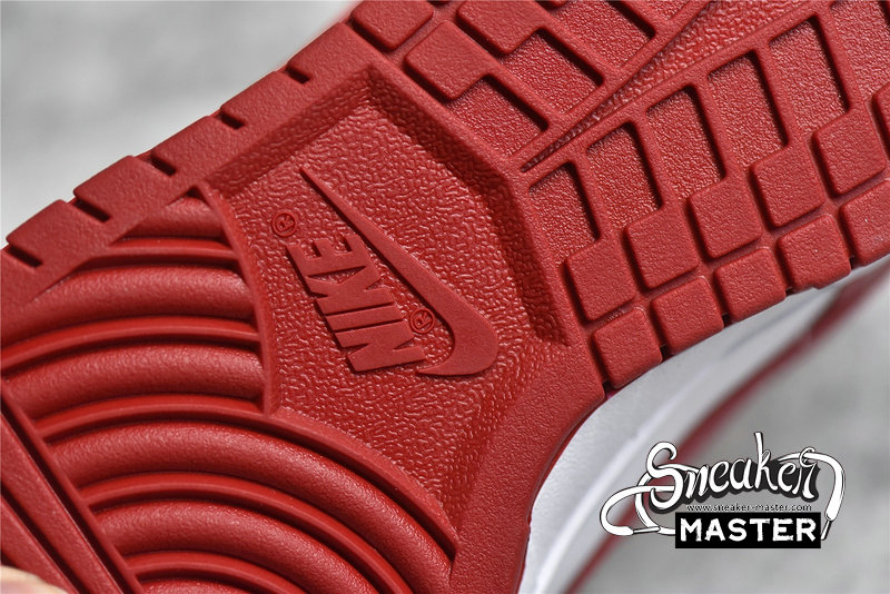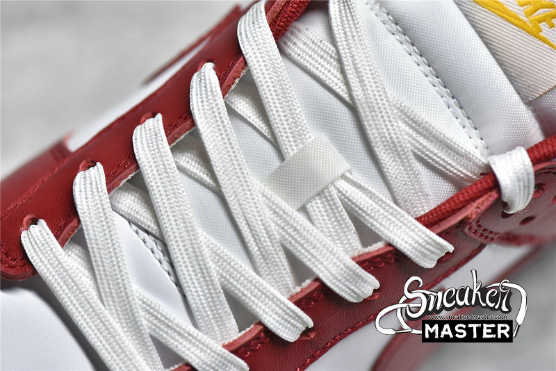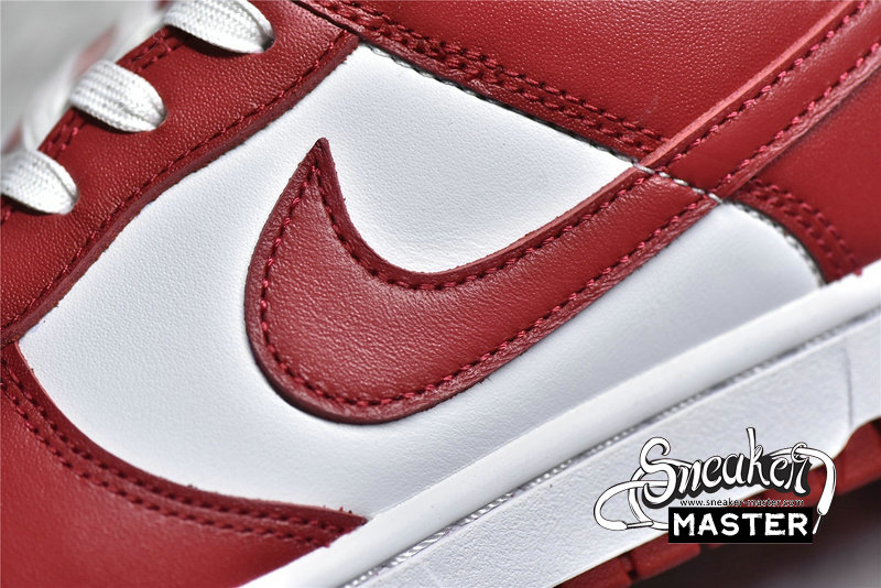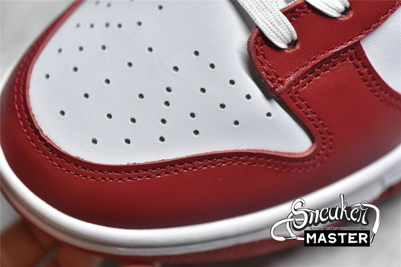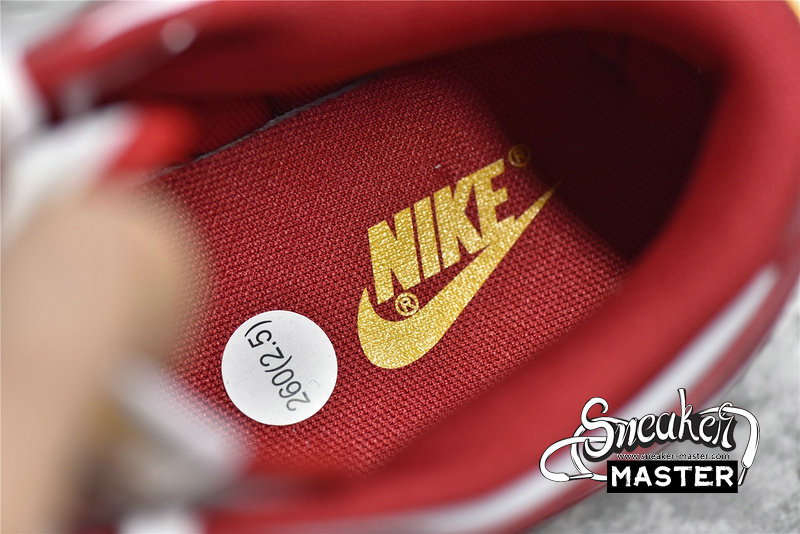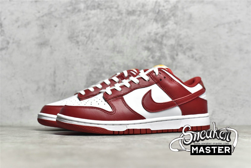 - This offering of the Nike Dunk Low comes constructed in a full leather build featuring a White leather base with Gym Red overlays, Swooshes, heel tabs, and rubber outsole. Golden Yellow branding on the tongues, heels, and insoles atop a White midsole completes the design.