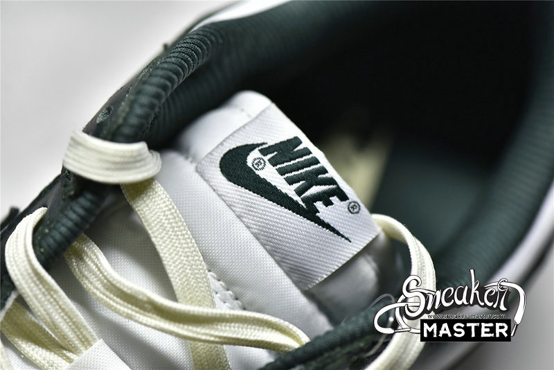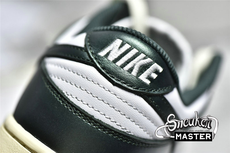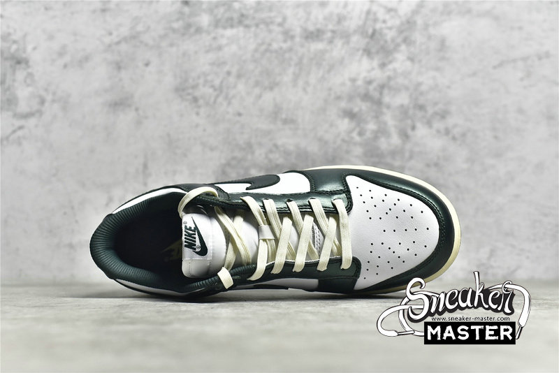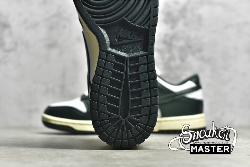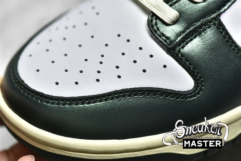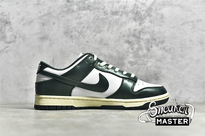 - This aged-offering of the Nike Dunk Low keeps things simple and traditional featuring a White leather base with matching nylon tongues, laces, and heel branding. Green leather overlays, Swooshes, lining, outsole, and tongue branding while the vintage aesthetic continues with Off-White laces, Cream Nike branding on the insoles atop a Yellowed midsole.