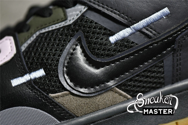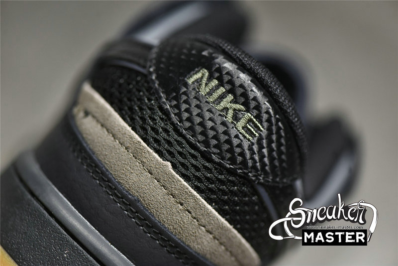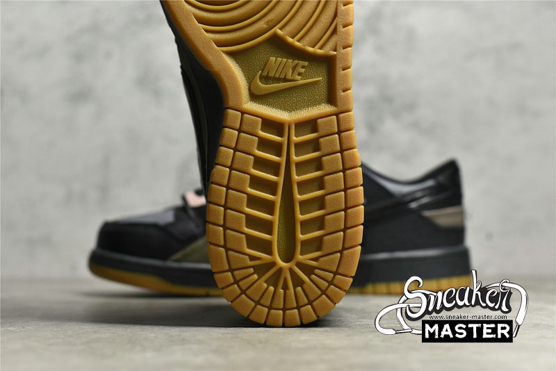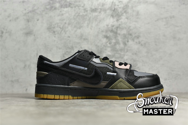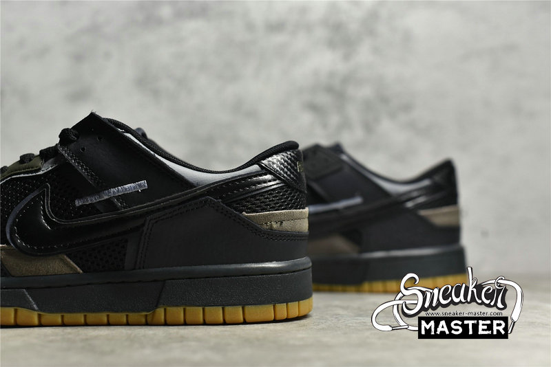 - This Nike Dunk Low comes constructed in a mix of mesh, leather, and suede materials detailed with patchwork and exposed stitching. A Black midsole atop a Gum rubber outsole completes the design.