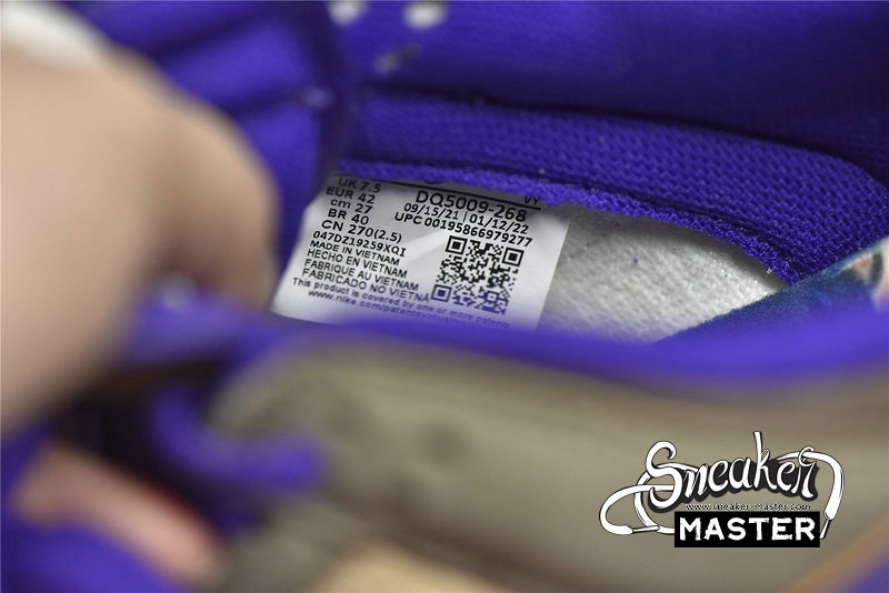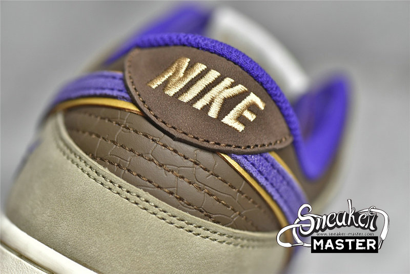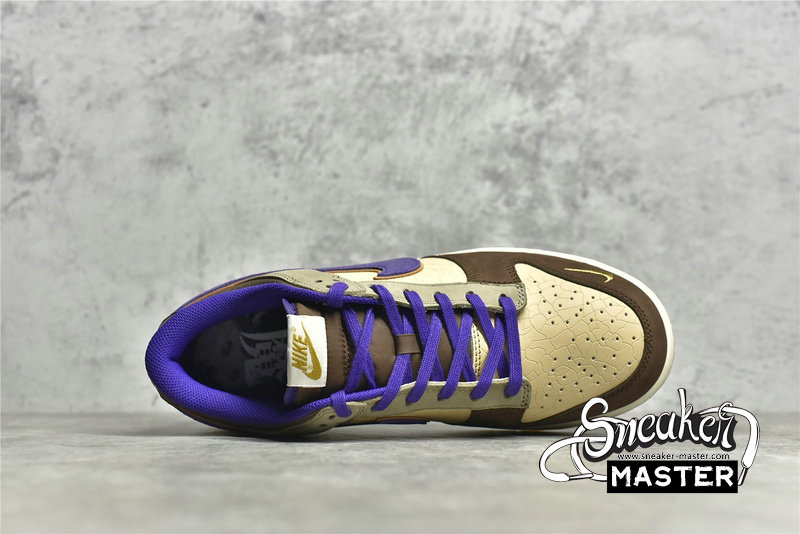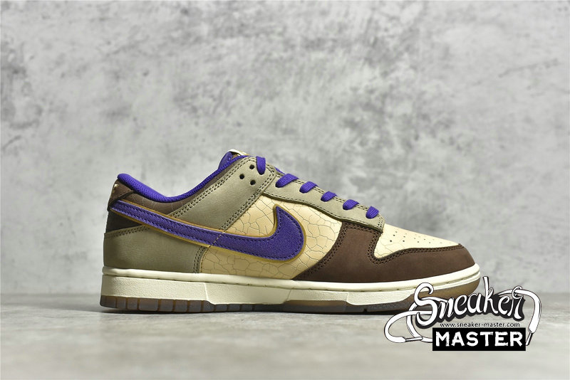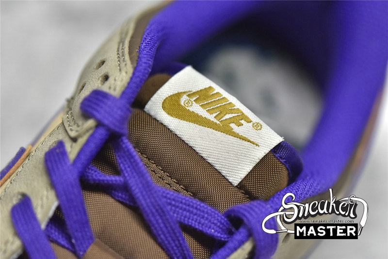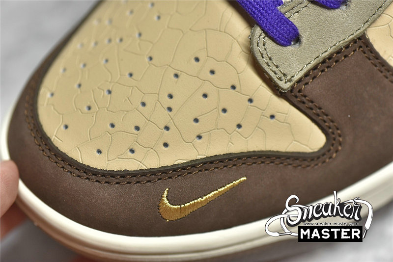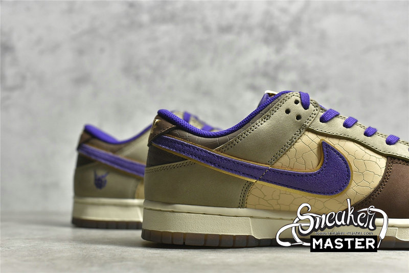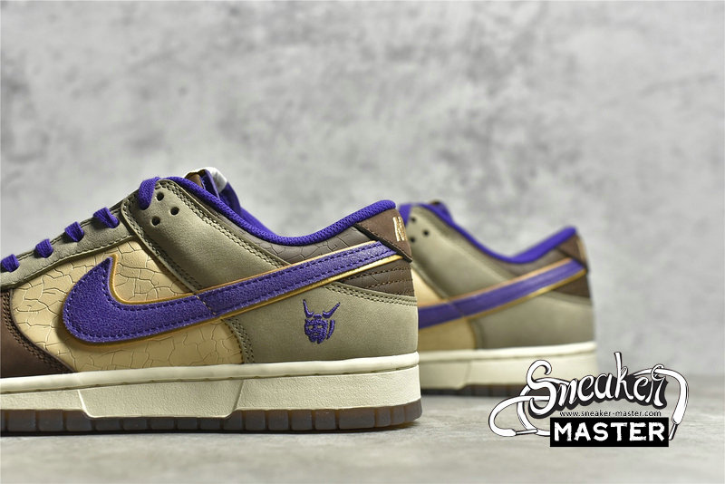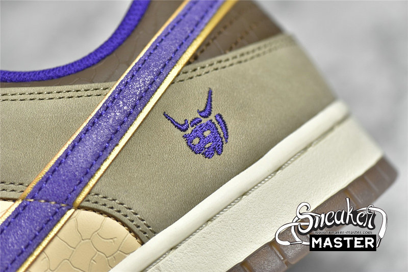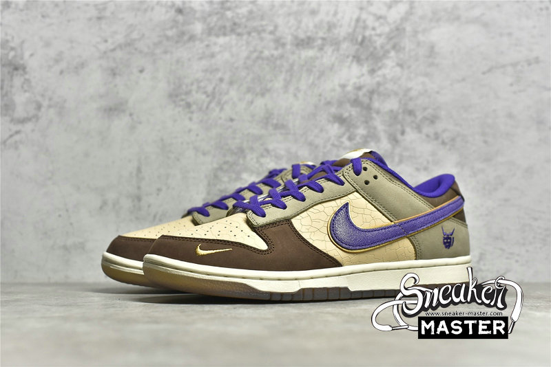 - This offering of the Nike Dunk Low features a Light Brown base paired with Khaki and Dark Brown overlays. Purple contrasting accents appear on the Swooshes, lining, tongues, and a “demon” embroidered on the lateral heel, which is an image of Tsuno Daishi, The Great Horned Master. A White midsole atop a semi-translucent outsole with a spacial artwork from the late Edo period (1840s) by Utagawa Kuniyoshi titled 金時の節分. It displays bean-throwing child hero known as Kintarō, who will grow up to be the mighty warrior Sakata Kintoki, one of the retainers of the famous demon-fighter Minamoto Yorimitsu (Raikō).