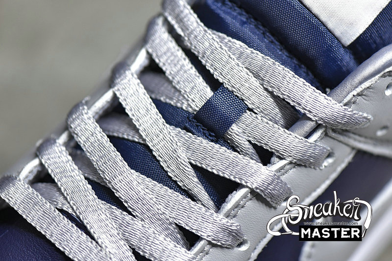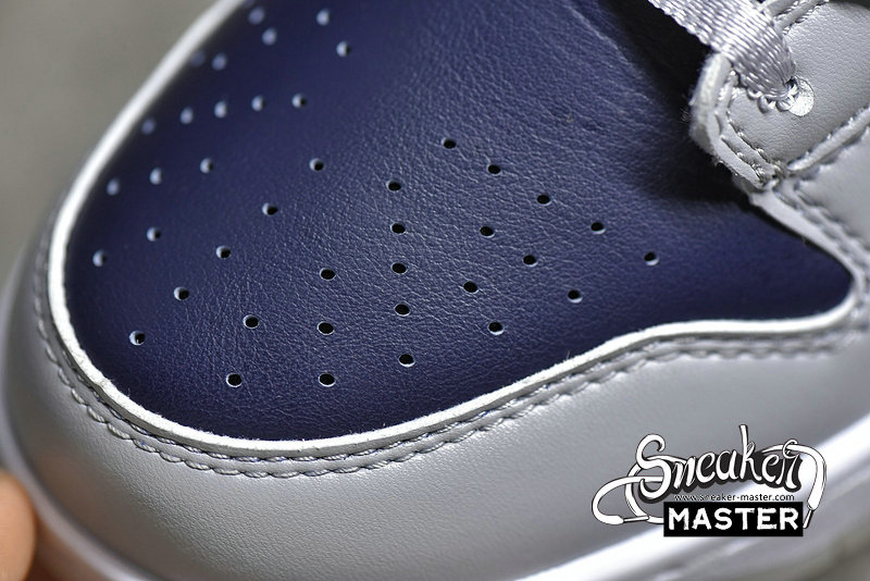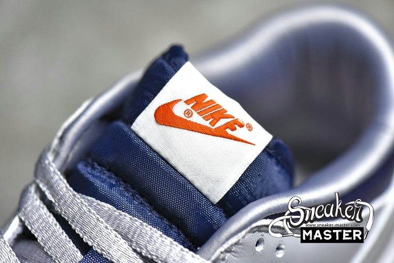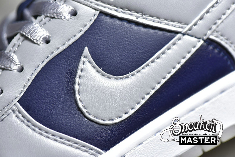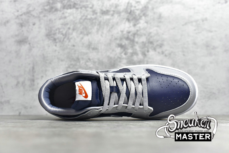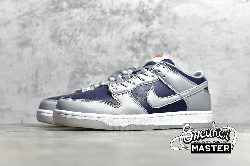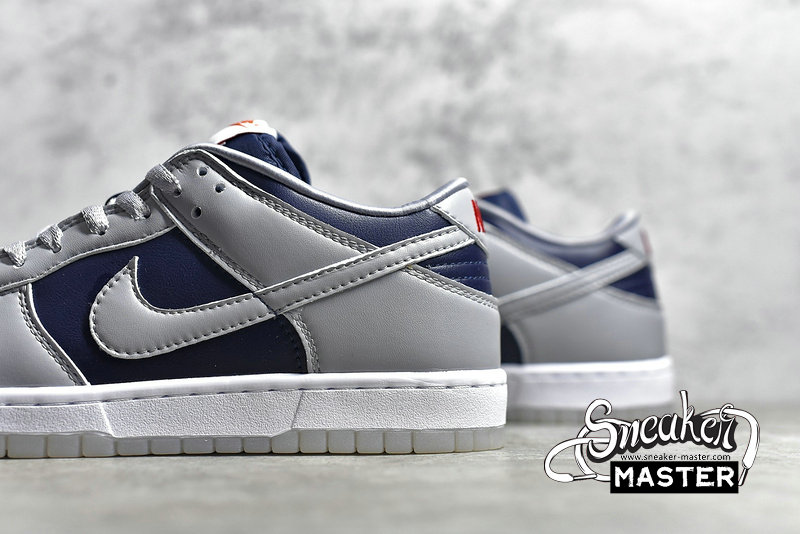 - The Dunk Low SP 'College Navy' brings a subdued look to its retro basketball construction. Built entirely with leather, the shoe's upper appears in a mix of College Navy and Wolf Grey, accented by the University Red branding on the heel patch and woven tongue tag. Satin on the laces and collar lining contributes to a luxe aesthetic, while underfoot, a translucent rubber outsole provides traction.