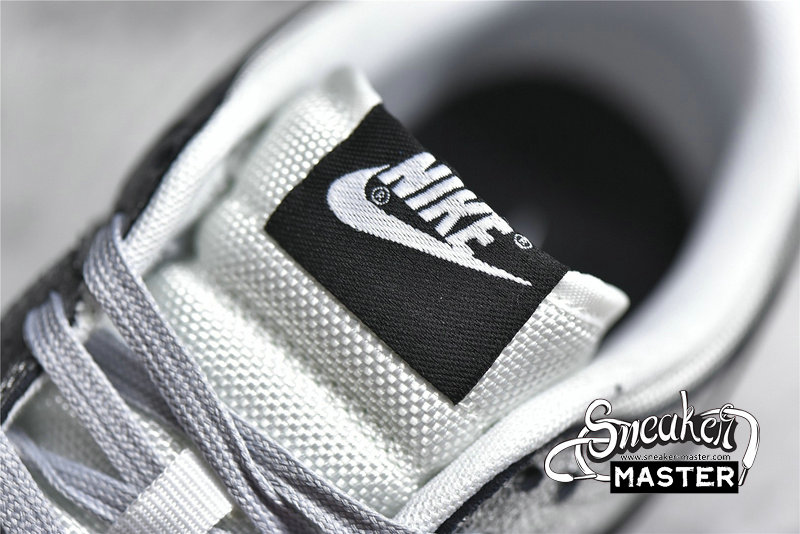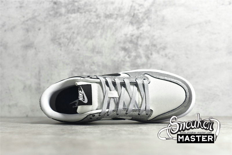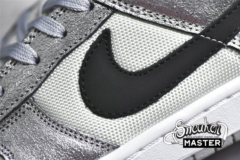 - This offering of the Nike Dunk Low features a White mesh upper with Metallic Silver cracked leather overlays. Black detailing appears on the Swooshes, tongue and heel branding and insole while having Grey laces and rubber soles atop a White midsole to complete the design.