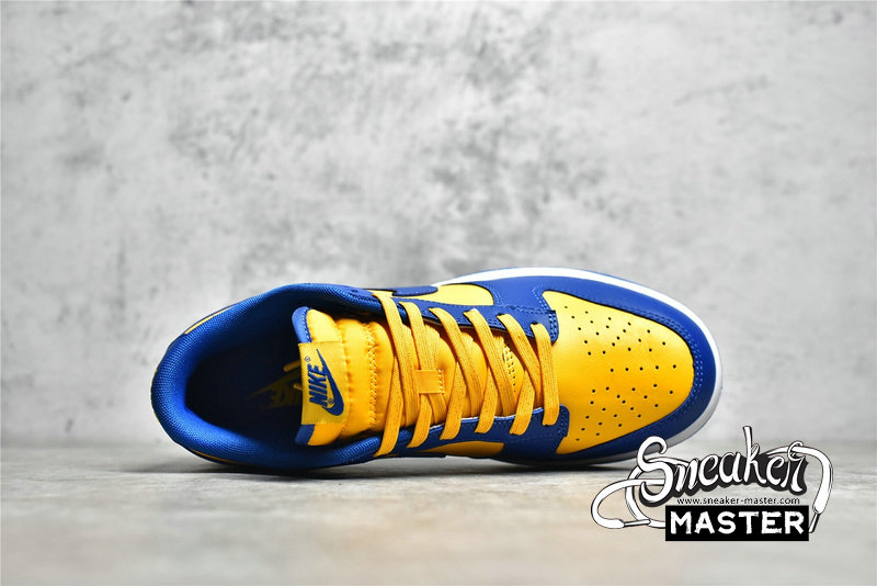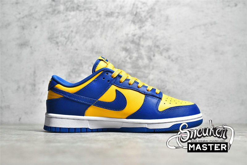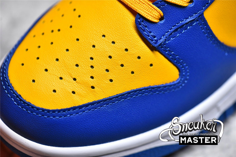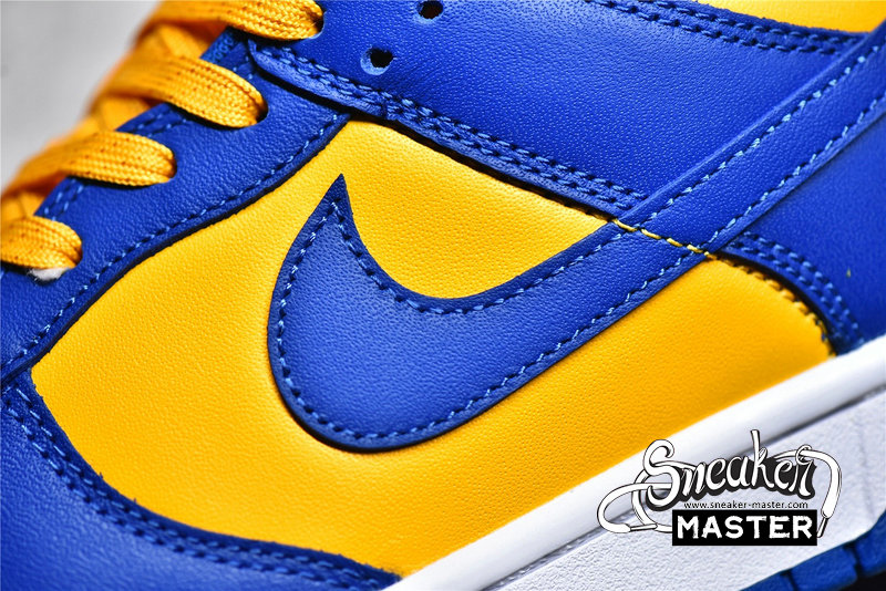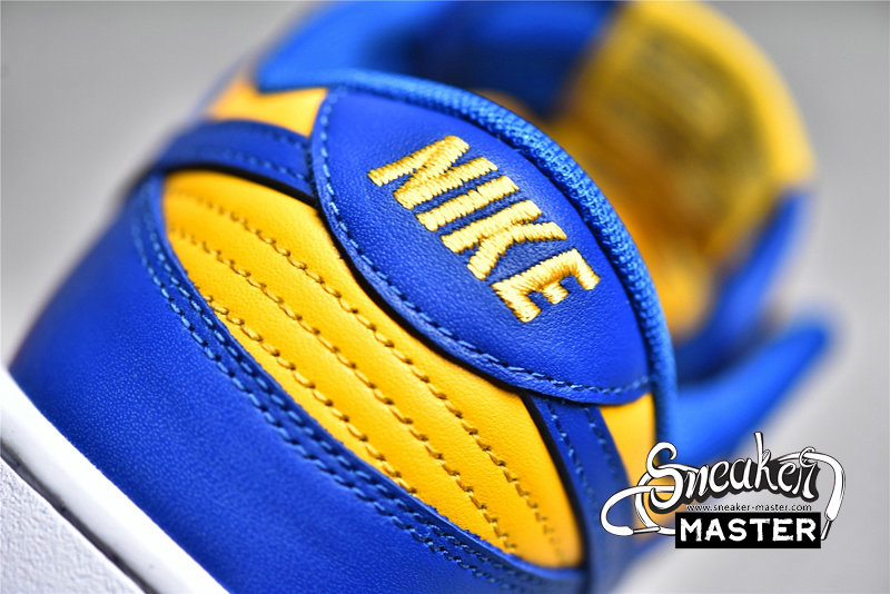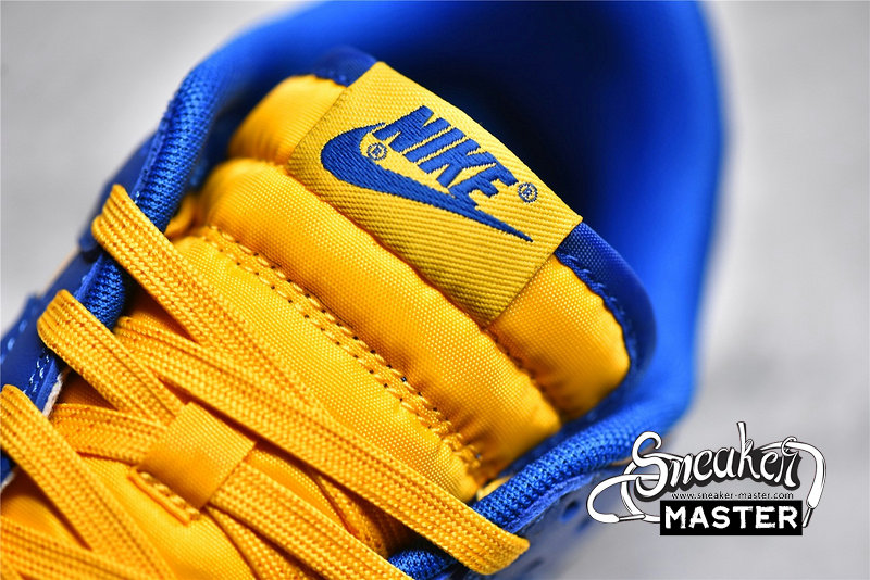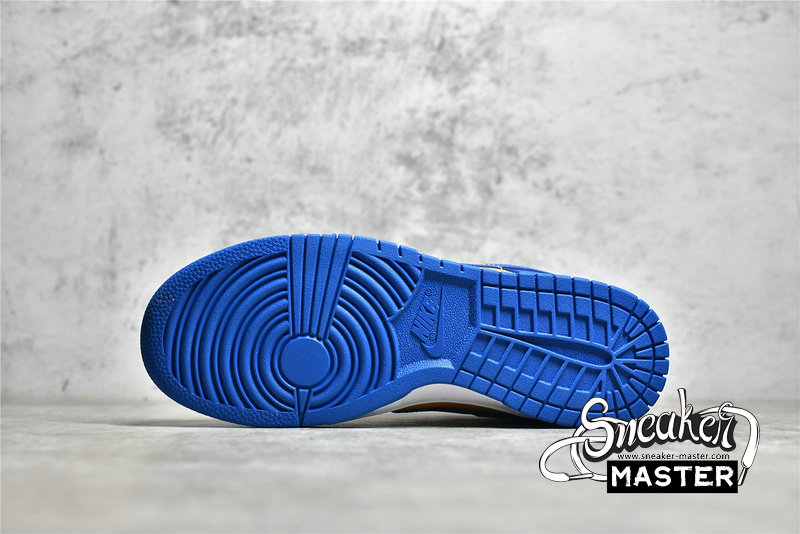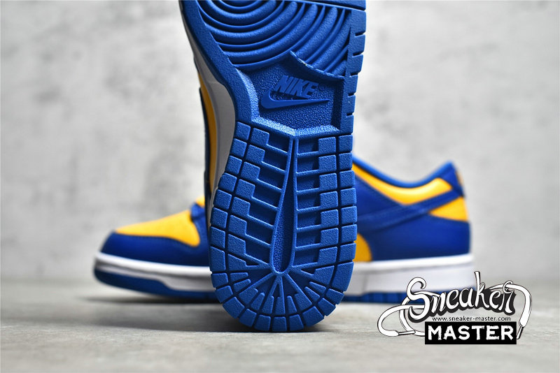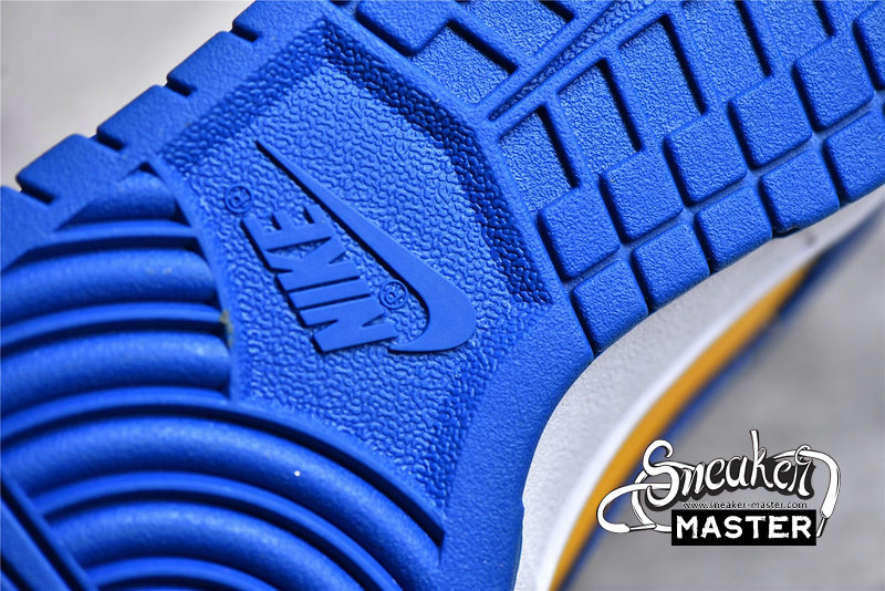 - This offering of the Nike Dunk Low comes constructed in a full leather build with a traditional two-tone makeup featuring a University Gold base with Royal Blue overlays. Both colors are also used on the branded areas while sitting atop a White midsole and Blue rubber outsole. The shoe will also come with extra set of laces.