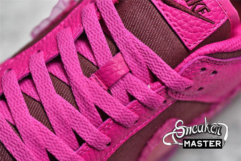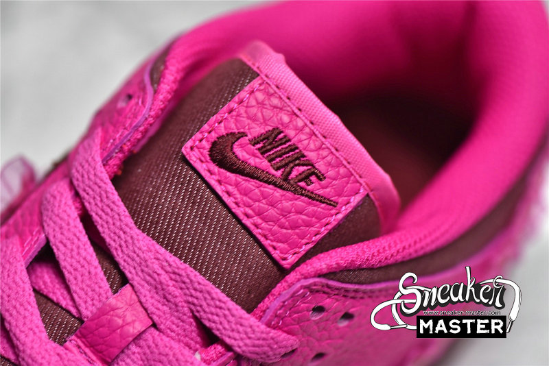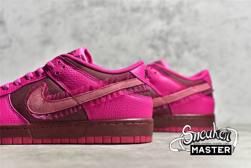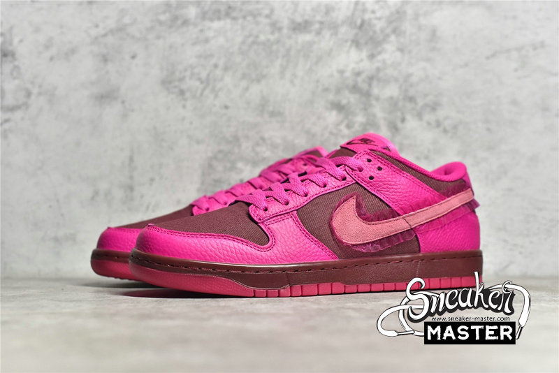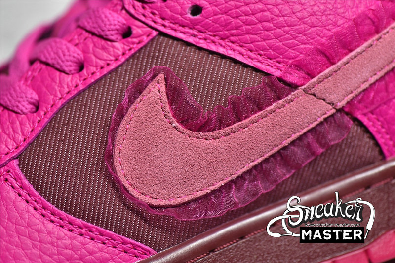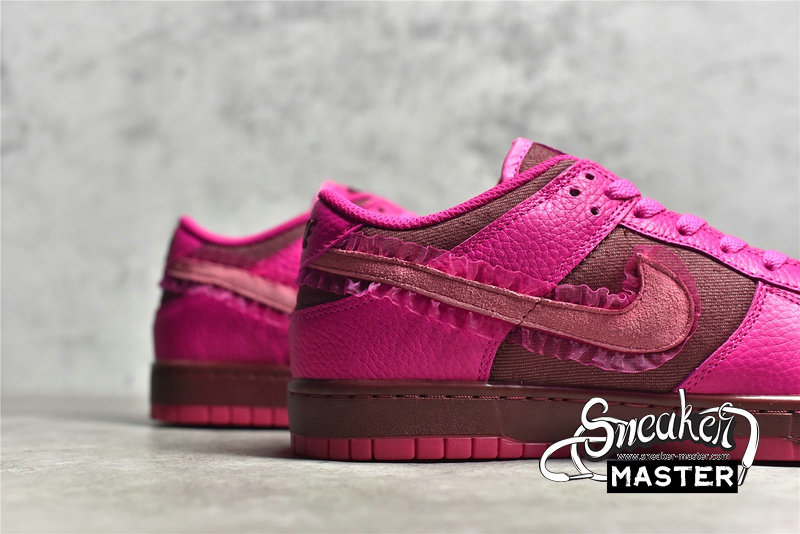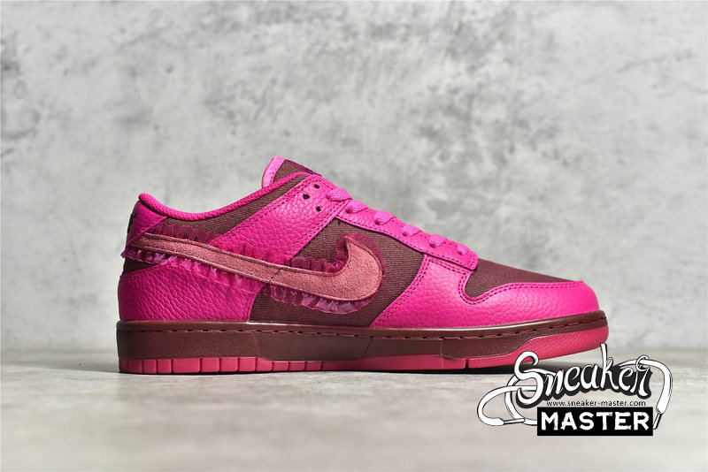 - Celebrating Valentine's Day with frilly detailing and vibrant colors is the Nike women's Dunk Low 'Valentine's Day.' The low-top's upper is constructed from textile twill in a rich Team Red hue. Tumbled leather overlays at the forefoot and heel are rendered in Pink Prime, while the color-matched hairy suede Swoosh is trimmed in pleated, translucent lace. The same burgundy and fuchsia colors are seen again on the rubber cupsole.
