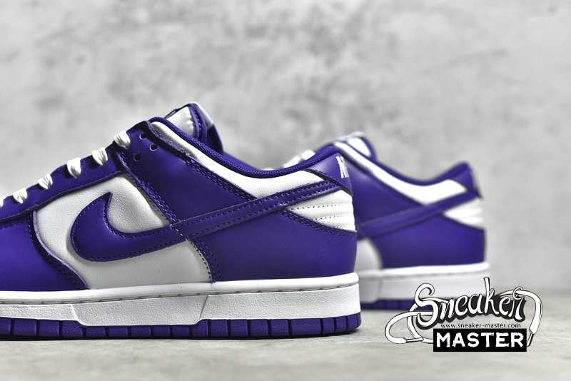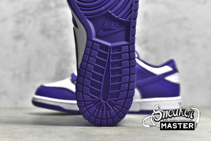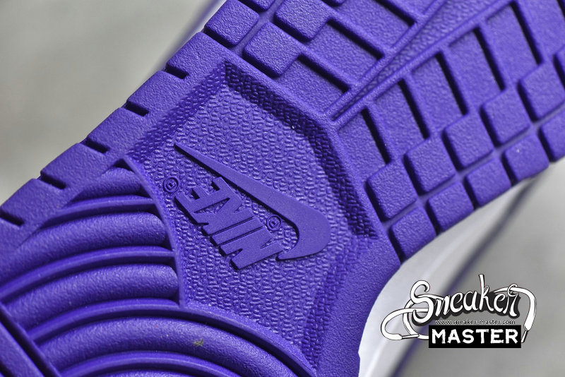 - This offering of the Nike Dunk Low keeps things simple and traditional featuring a White leather base with perforations at the toe box. Purple overlays, lining, Swooshes, tongue branding, heel tabs and insoles with White continuing on the tongues, laces, “NIKE” branding in the rear and midsoles. A Purple rubber outsole completes the design.
