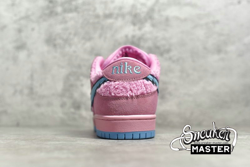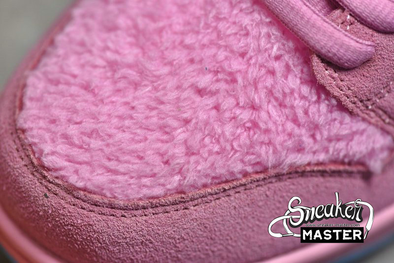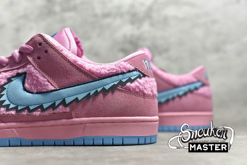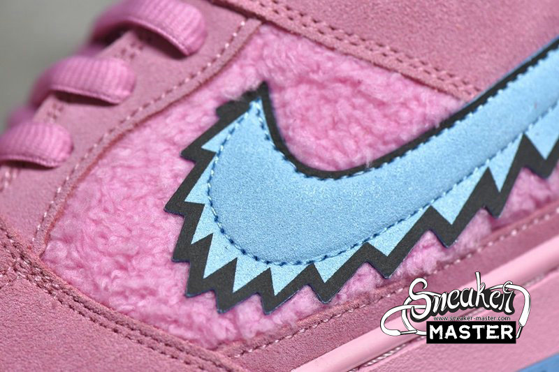- Switching up the titular color from the Orange Bear, Digital Pink coats the suede overlays with a smooth finish. Meanwhile, Pink tuffs of faux fur burst from the toe box, quarter panel underlays and low-profile liner. While preset Pink laces end in Red and Blue aglets, the SB Dunk Grateful Dead Bear comes with an additional set of Aqua Blue laces. The breathable mesh tongue with an added zipper pouch reveals an Aqua Pink liner of its own. This matched the Blue hitting the jagged quarter panel Swoosh to match the bear’s collar, as well as the rubber outsole. Subsequently, the sole insert displays all 5 colored Bears dancing together with the Pink Bear closest to the toe.