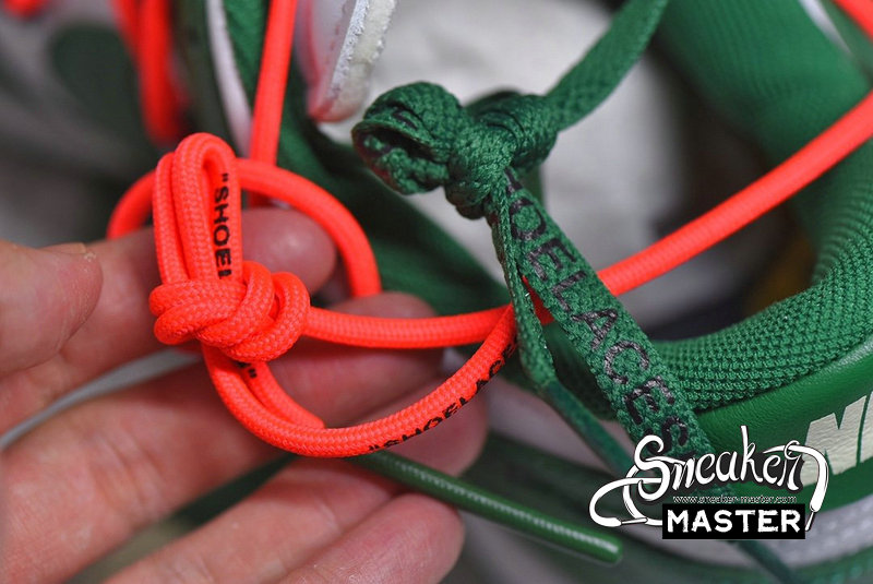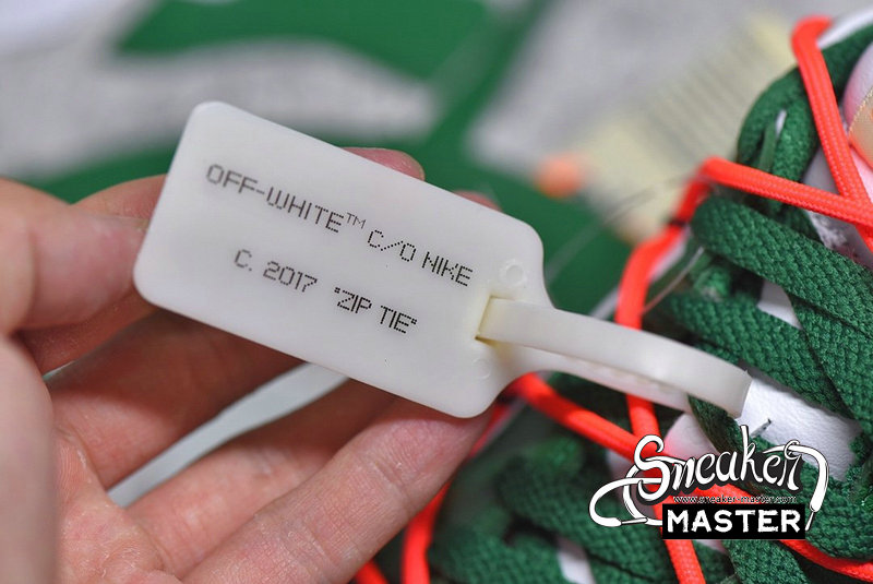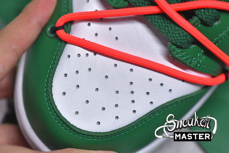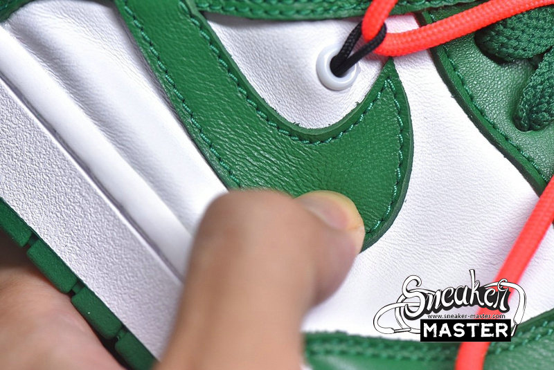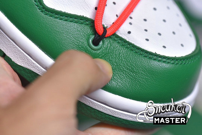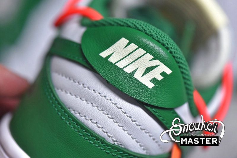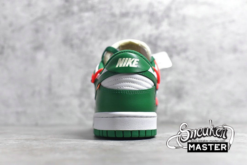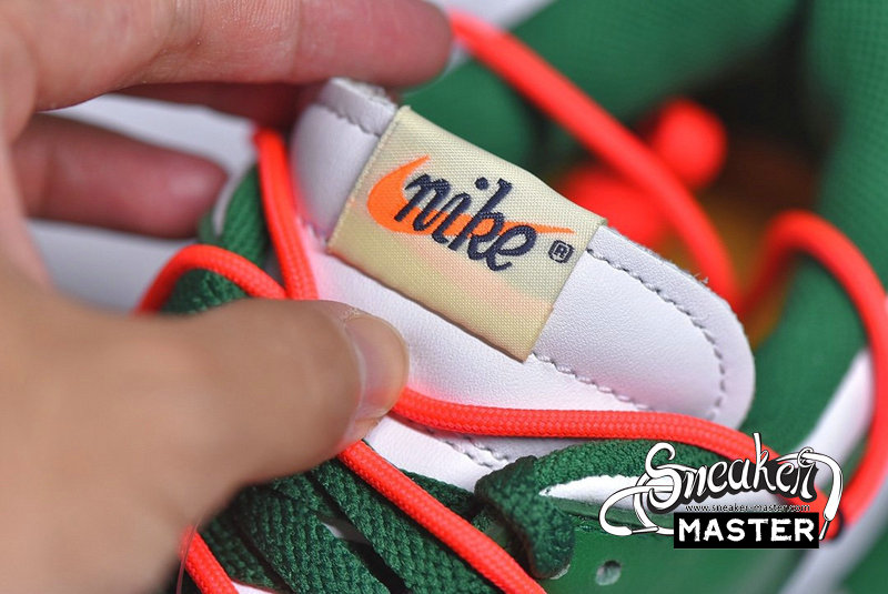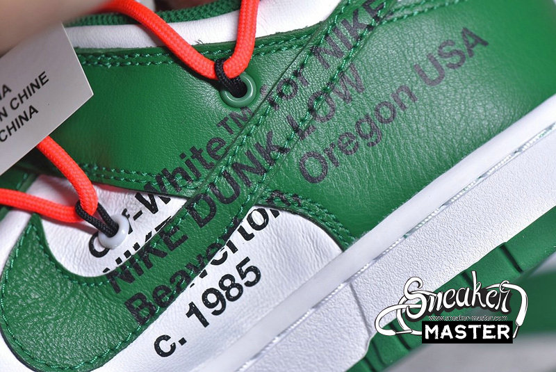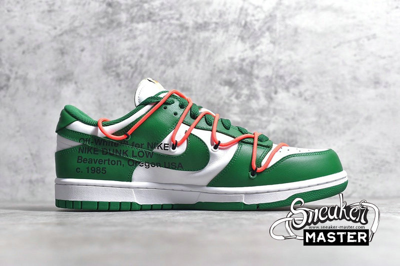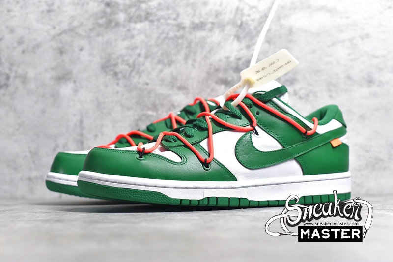 - Emerging with Virgil Abloh's signature design touch, the OFF-WHITE x Dunk Low 'Pine Green' released as part of a three-shoe collection. The upper appears in Pine Green and white on its leather construciton, accented by an orange flag label on the lateral side and overbranding on the medial. A second lacing system overlays the first, while underfoot, a two-tone rubber cupsole provides support.