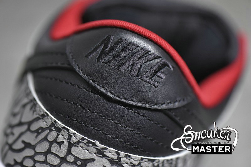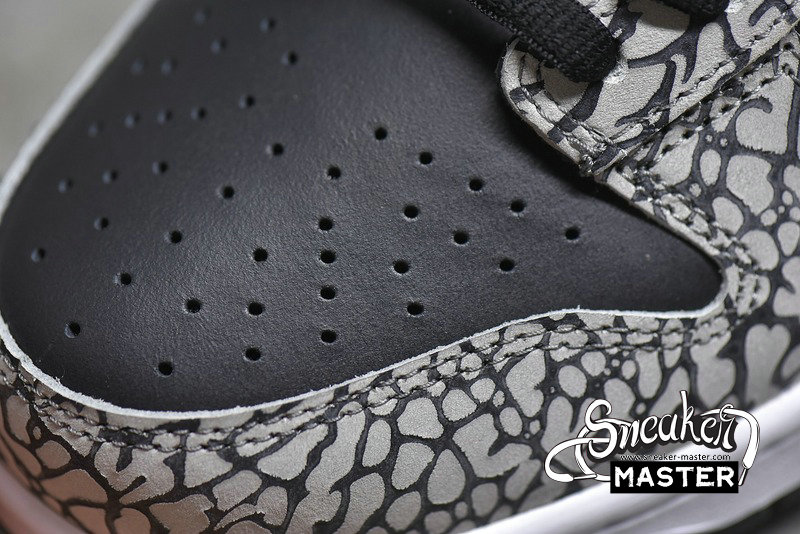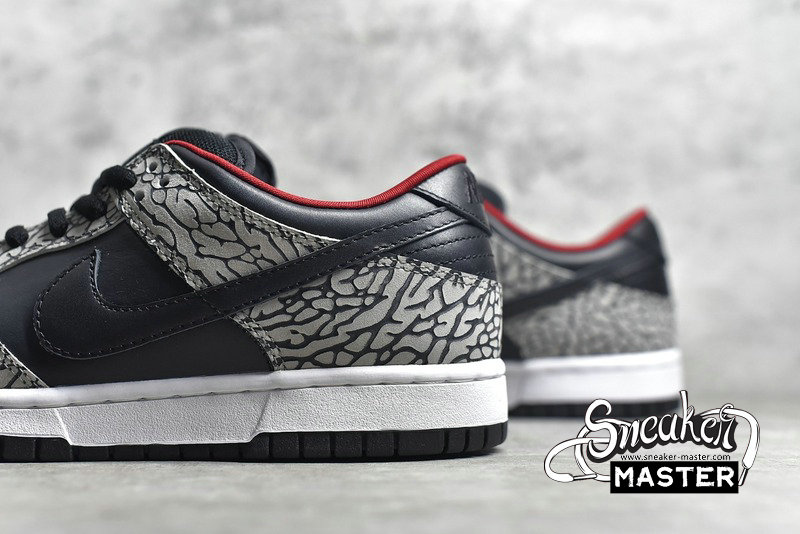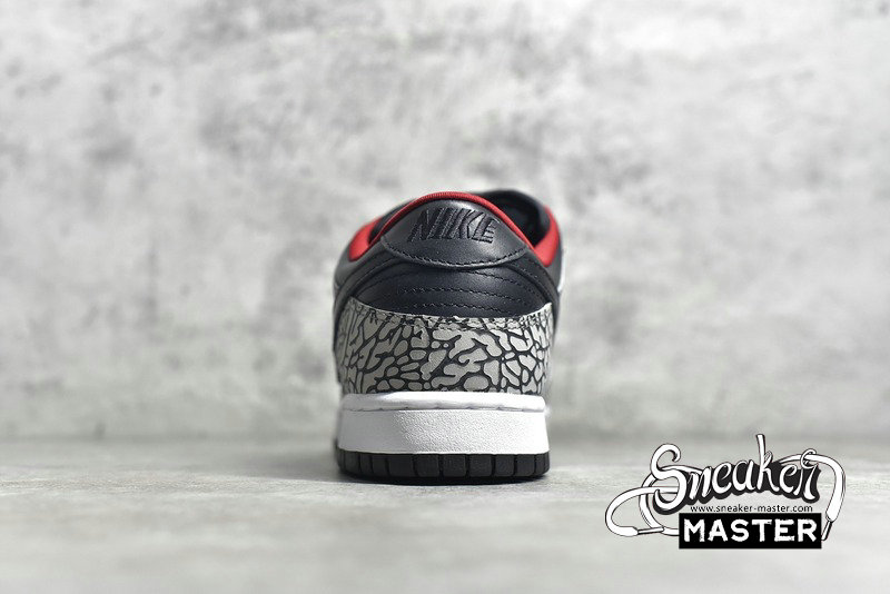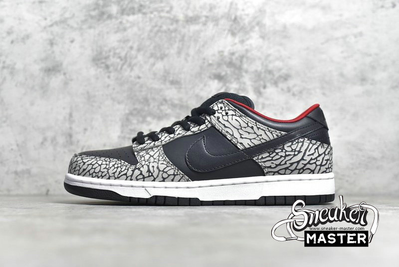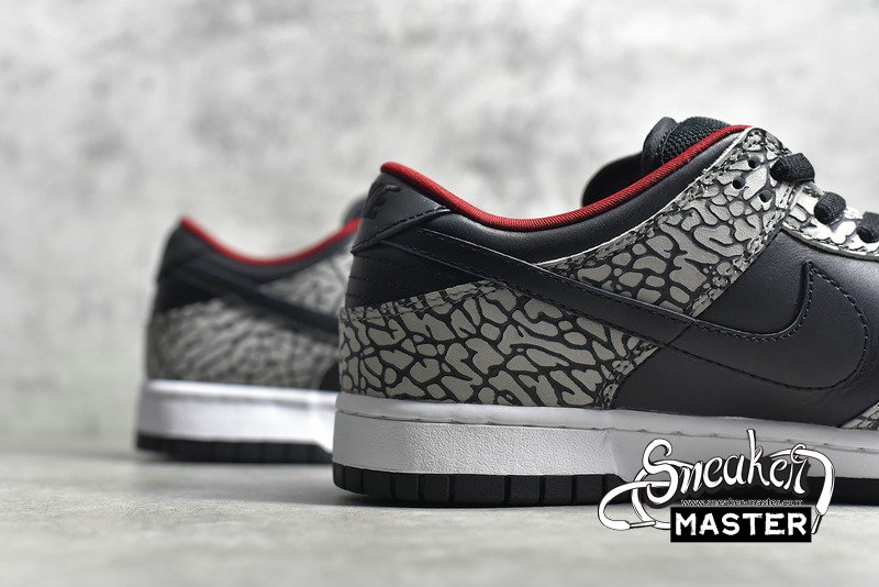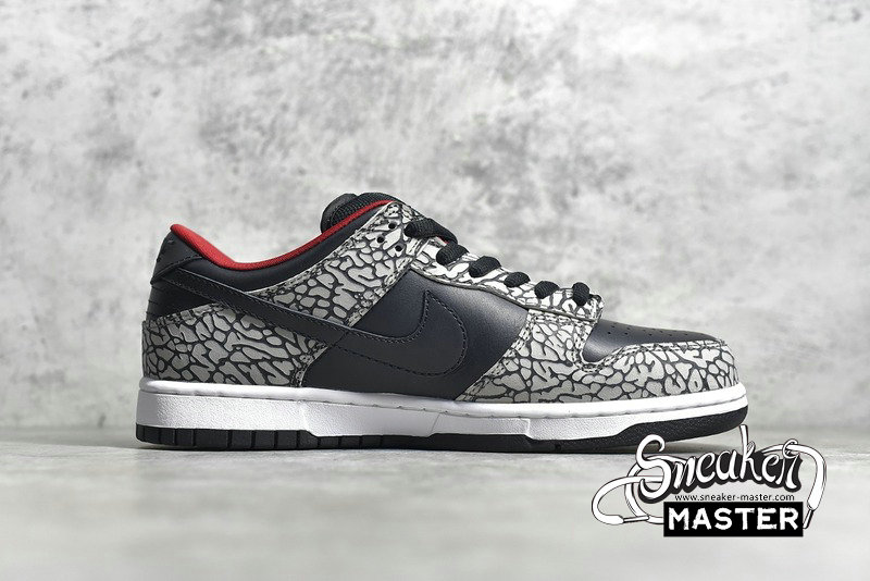 - A collaboration between Nike and Supreme, the Supreme x Dunk Low Pro SB 'Black Cement' puts the Air Jordan 3's iconic elephant print on the Dunk Low Pro. The design emerges on the nubuck overlays, while the rest of the upper is built with black leather. More black emerges on the Swoosh and laces, with red on the lining bringing the only color to the look.