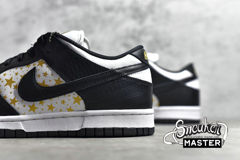 - A spiritual follow-up to a 2003 Dunk High collaboration, the Supreme x Dunk Low OG SB QS 'Black' released in March 2021. Emerging with a look similar to its predecessor, the shoe's white leather upper is highlighted by metallic gold stars on the side wall. The black leather overlays sport crocodile detailing, while more metallic gold marks the tongue tag, heel patch and Supreme-branded lace deubré. Underfoot, a red custom sockliner sports co-branding, with Zoom Air providing cushioning.