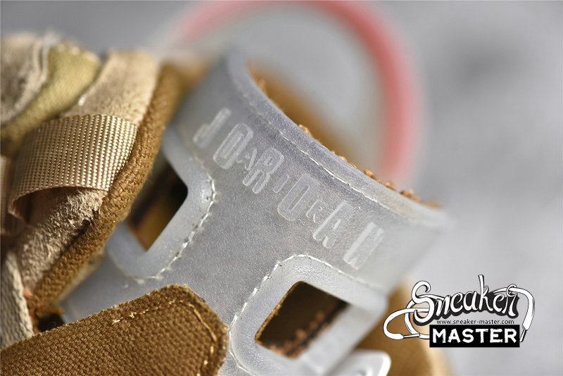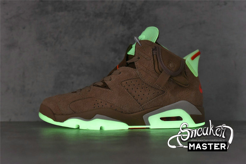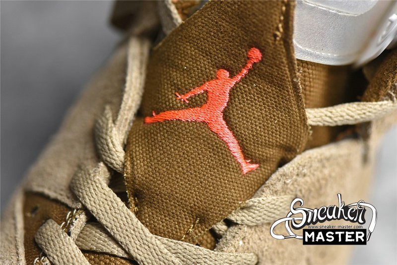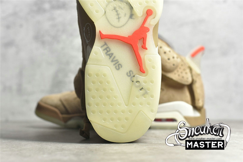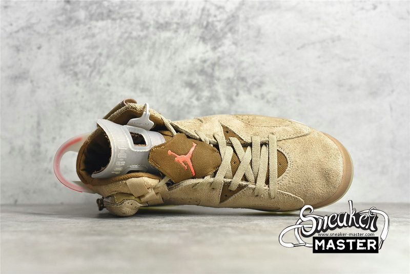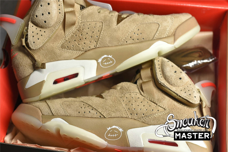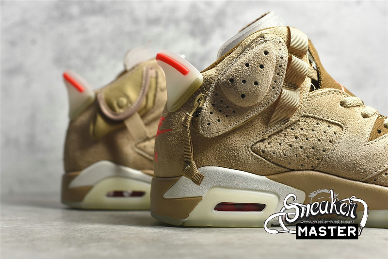- A follow-up to a 2019 collaboration, the Travis Scott x Air Jordan 6 Retro 'British Khaki' released with the help of the Houston rapper. Built with a mix of suede and canvas, the shoe's upper appears in British Khaki, highlighted by Bright Crimson on the heel pull-loop and tongue branding. The lateral collar includes a stash pouch, with the medial side sporting zippered detailing. The heels include mismatched Air and Cactus Jack branding, and underfoot, the usual visible Air in the heel provides cushioning.