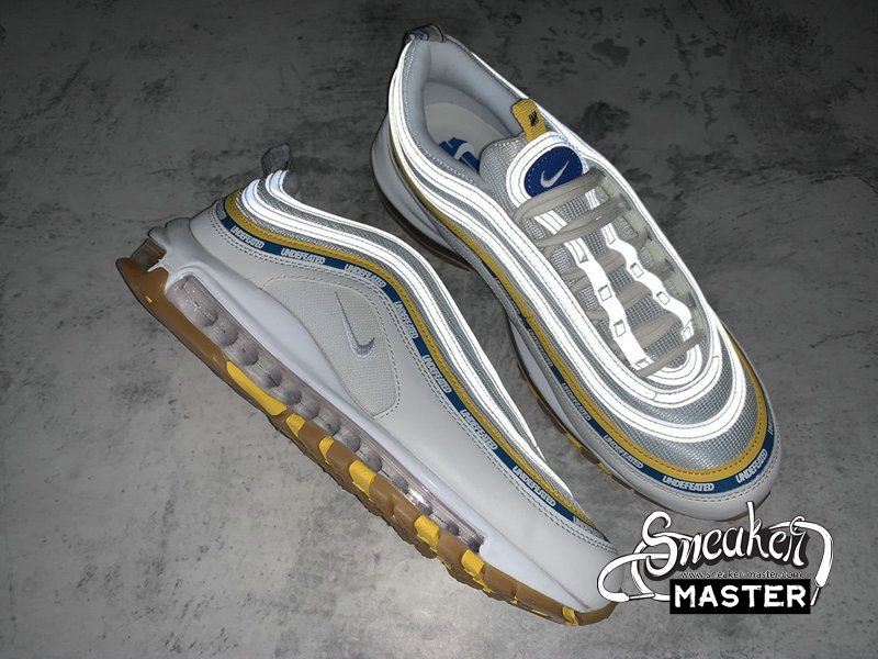 - Made in collaboration with the Los Angeles streetwear brand, the Undefeated x Air Max 97 'UCLA Bruins' gives the nod to UCLA. As a result, the shoe's upper sports a white base highlighted by Aero Blue and Midwest Gold, with Undefeated branding wrapping around the design. Reflective hits further accent the look, while the insole and tongue tag include a Five Strikes logo. Underfoot, full-length Max Air provides cushioning, giving way to a gum rubber waffle outsole for traction.