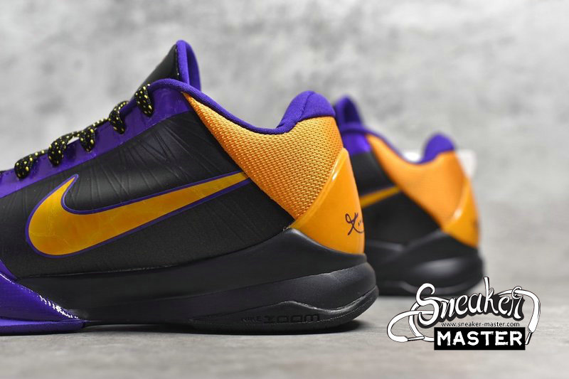 - Giving the nod to the only NBA franchise Kobe Bryant played for, the Zoom Kobe 5 'Lakers' features a black upper with Del Sol and Varsity Purple accents. Flywire cables support the fit up top, while the Phylon midsole incorporates Zoom units for cushioning. The rubber outsole sports an EKG-inspired traction pattern.