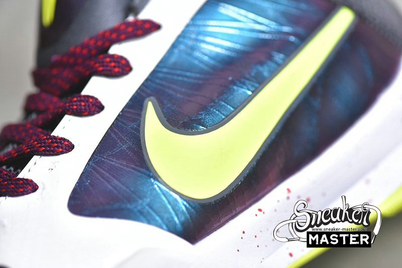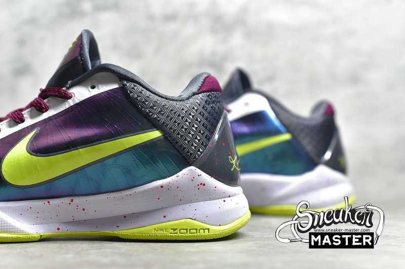 - Commemorating its 10th anniversary, the Nike Zoom Kobe 5 Protro resurfaced in December 2019 with its homage to DC Comics supervillain, the Joker. This 'Chaos' variant calls to mind the character's signature suit in a multicolored, mixed-material upper with eye-catching lizard skin textures, speckled laces, and a robust toe cap. Neon green branding hints at the charatcer's hair. The sneaker sports a splattered midsole and vivid rubber outsole.