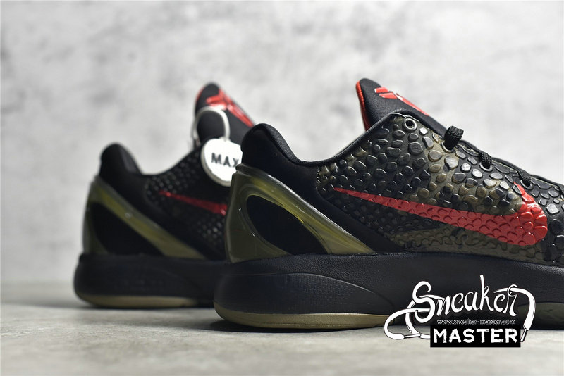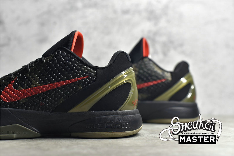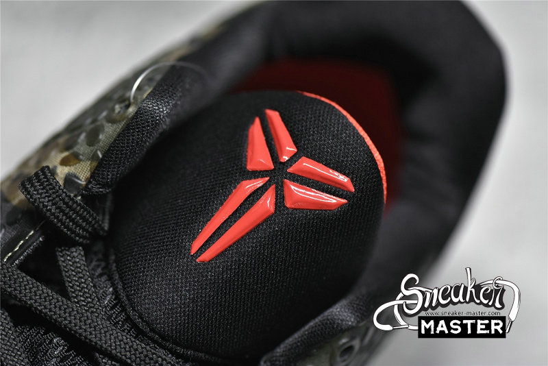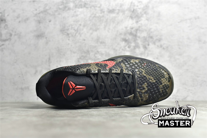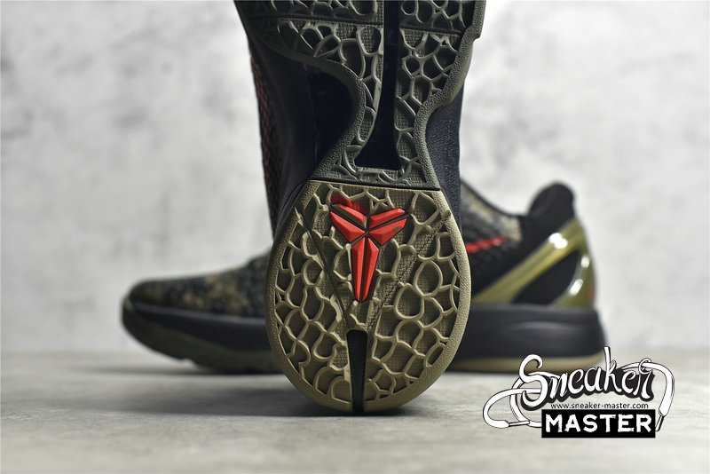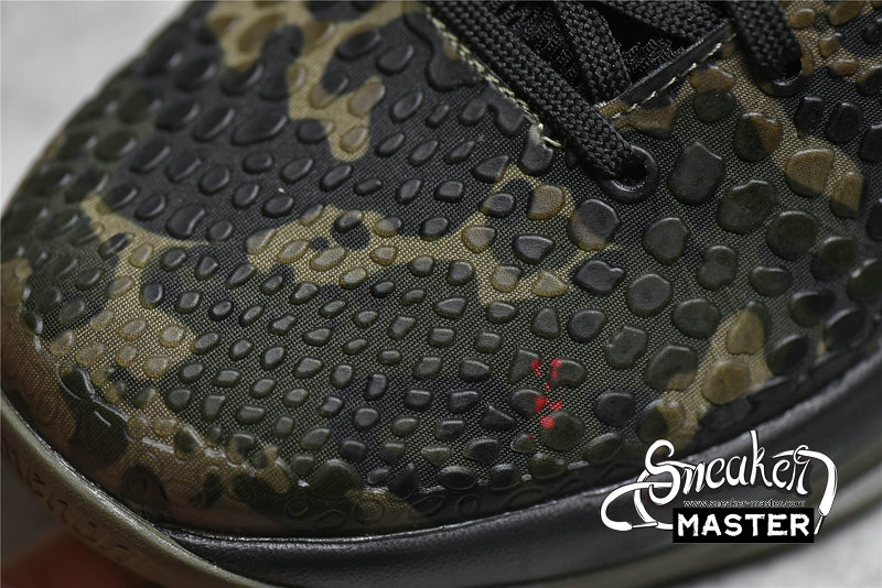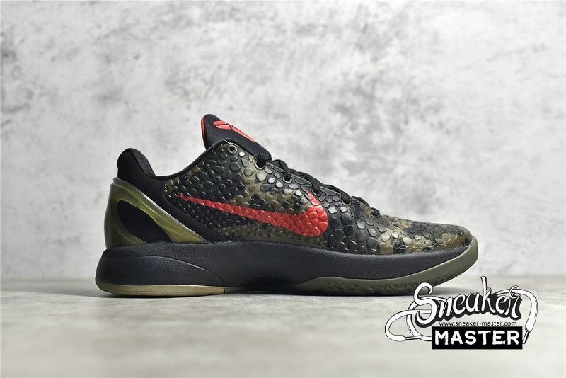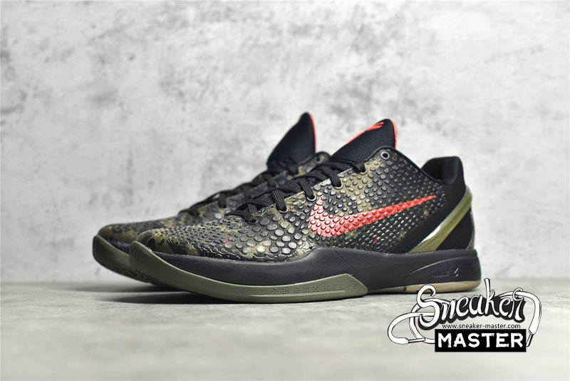 - The Zoom Kobe 6 'Camo' features a utilitarian colorway that works a camo pattern into its signature polyurethane snakeskin-textured upper. The tongue and Swoosh branding add contrasting crimson, while the heel counter maintains the otherwise-subdued look. The black midsole houses Zoom Air in the forefoot and heel.