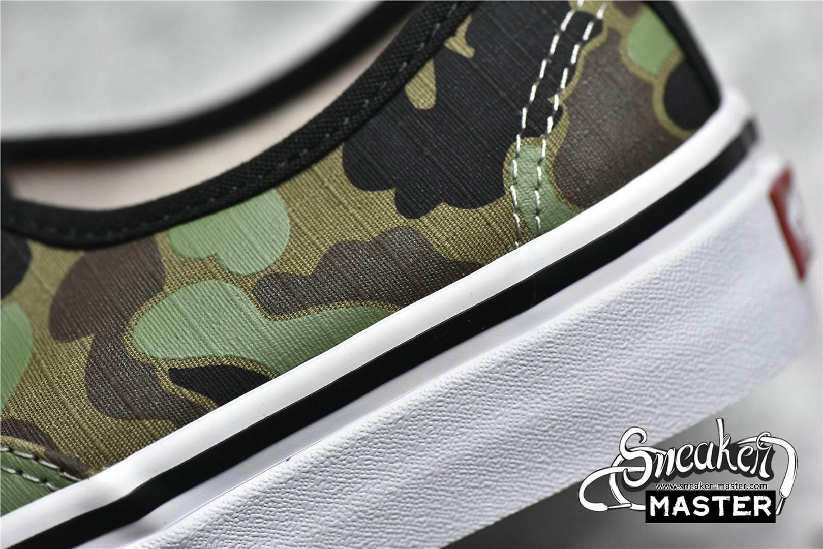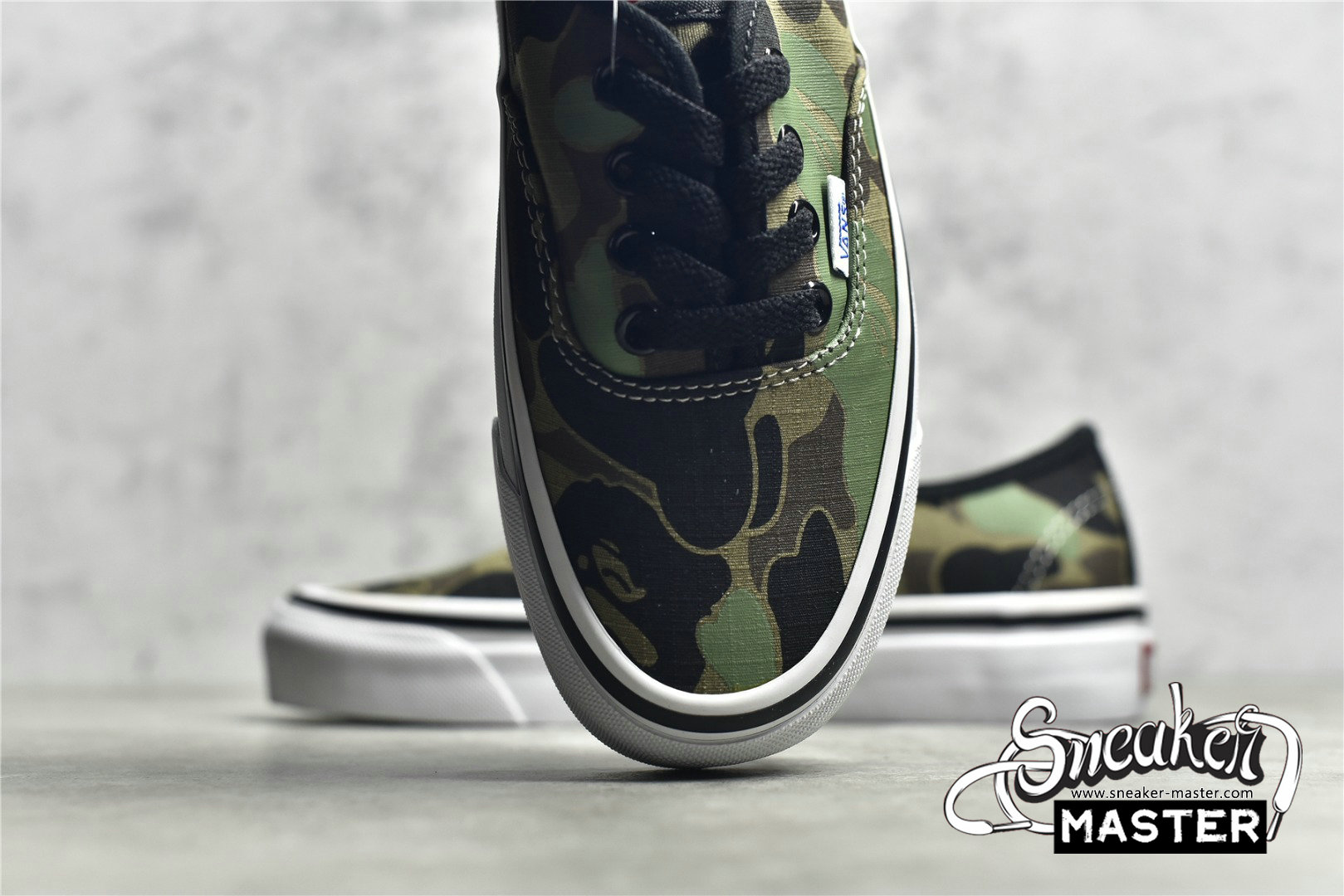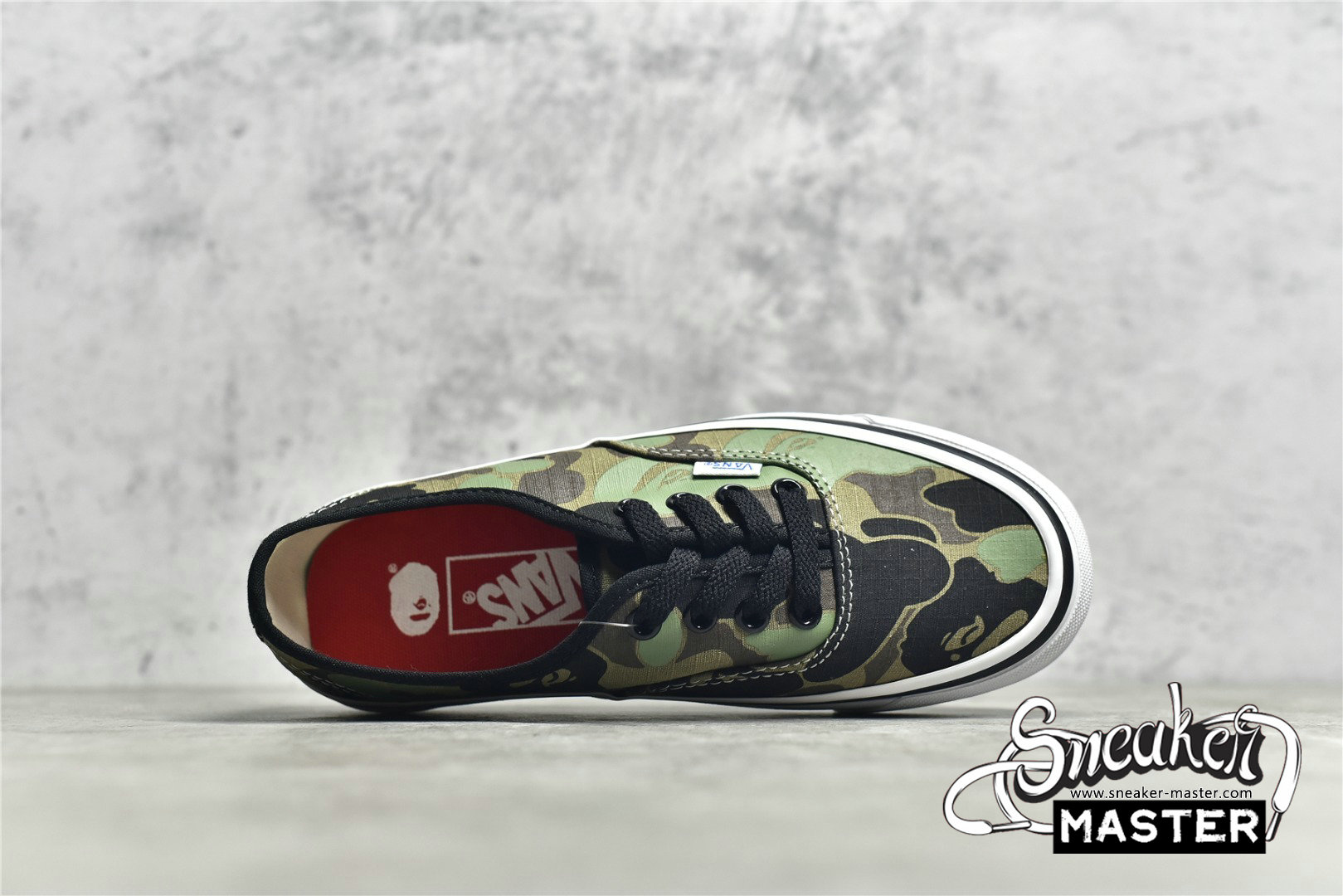 - Combining the partner brands' signature design hallmark is the BAPE x Vans Authentic 44 DX 'First Camo.' BAPE's 1st Camo print, part of the capsule collection with the streetwear label, features woodland hues on Vans' traditional canvas upper built on a crisp white rubber midsole with a contrasting black foxing stripe. Inside is a crimson sockliner with dual BAPE and Vans branding with a matching red waffle-traction outsole.