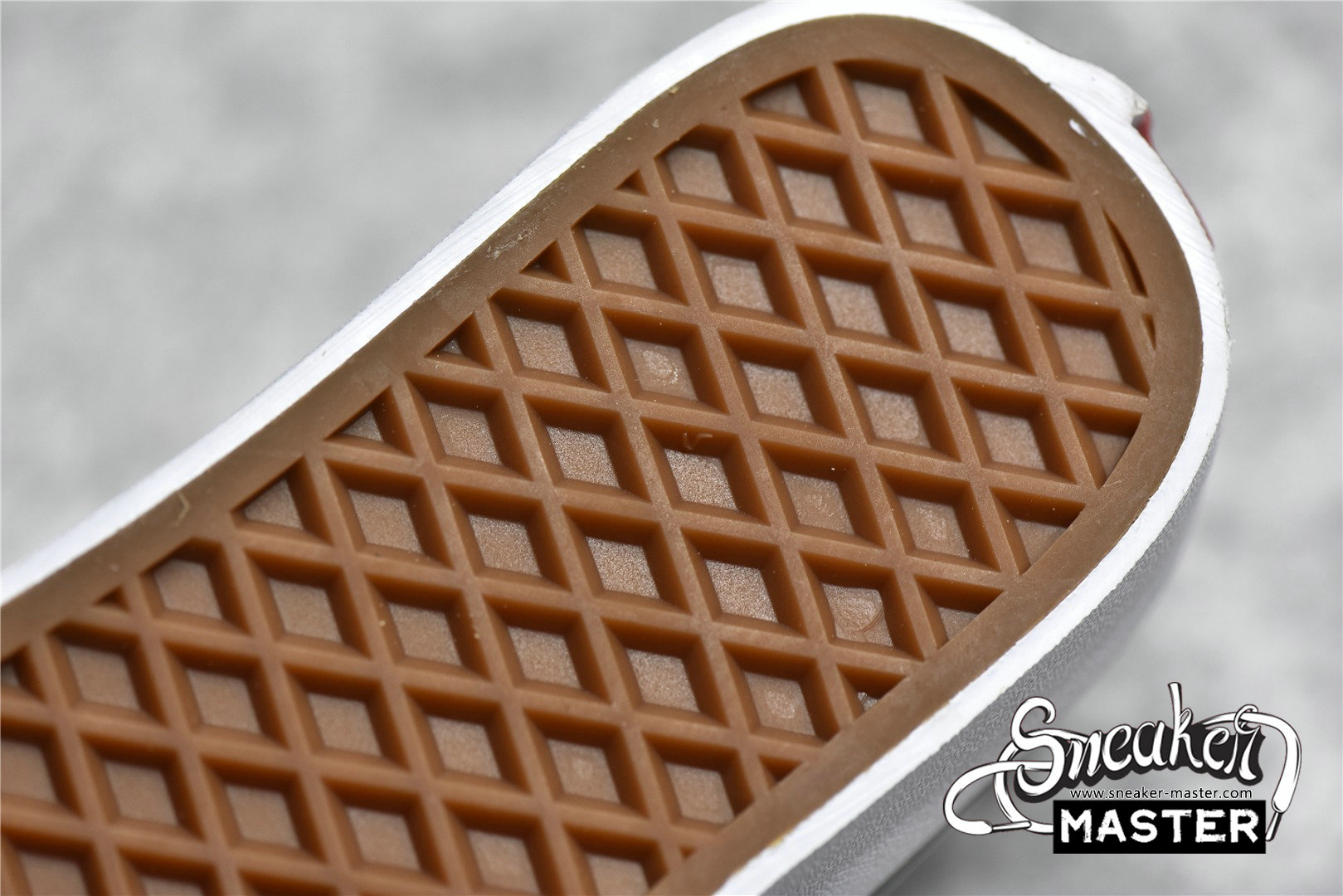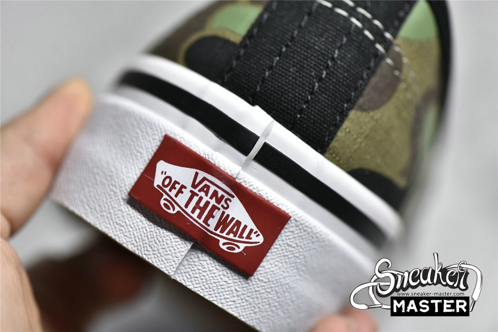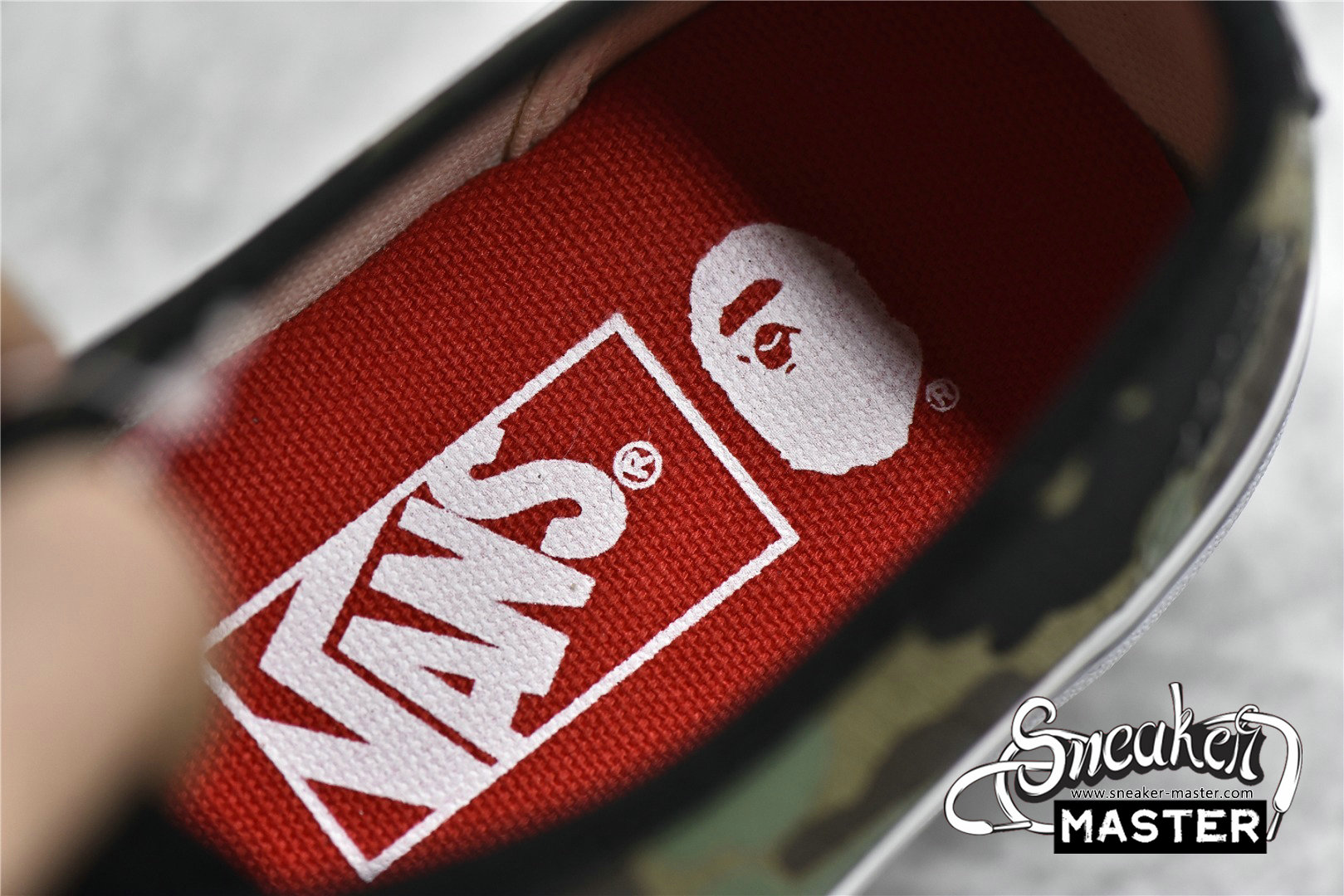 - Combining the partner brands' signature design hallmark is the BAPE x Vans Authentic 44 DX 'First Camo.' BAPE's 1st Camo print, part of the capsule collection with the streetwear label, features woodland hues on Vans' traditional canvas upper built on a crisp white rubber midsole with a contrasting black foxing stripe. Inside is a crimson sockliner with dual BAPE and Vans branding with a matching red waffle-traction outsole.